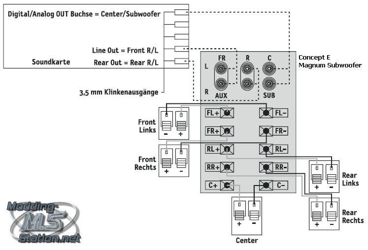 und wie werden die dann wo angeschlossen ( Die eine Seite an der Soundkarte is ja klar, aber dann am Sub, sofern der die Anschlüsse für die einzelnen Boxen drin hat ? )