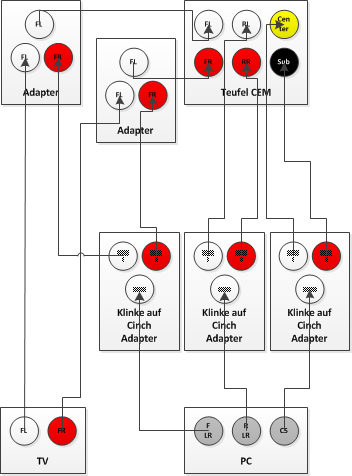 Ich habe an meinem Rechner ein Teufel E Magnum Set stehen, Baujahr 2006. Dieses ist an eine Creative Karte mit drei Eingängen (Sub, Front, Rear) angeschlossen. Das istr soweit alles in Ordnung und auf 5.1 eingestellt.