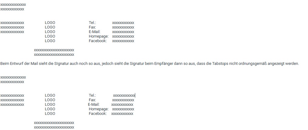 Ich habe auch schon ausprobiert, in Word 2010 eine Tabelle zu erstellen, in der ich das Logo eingefügt habe etc. Jedoch ist dann bei der Signatur ein größerer Seitenabstand nach links als in dem eigentlichen Text.