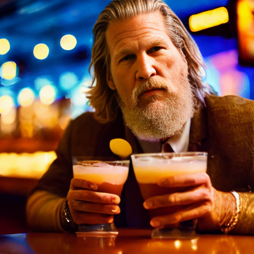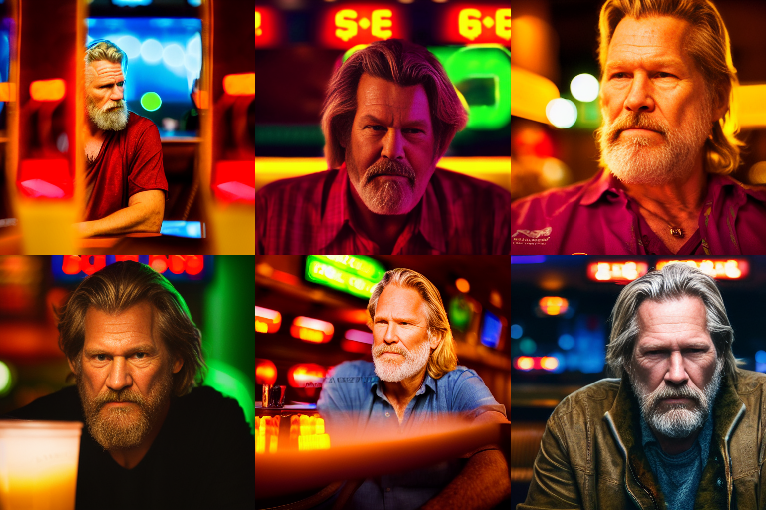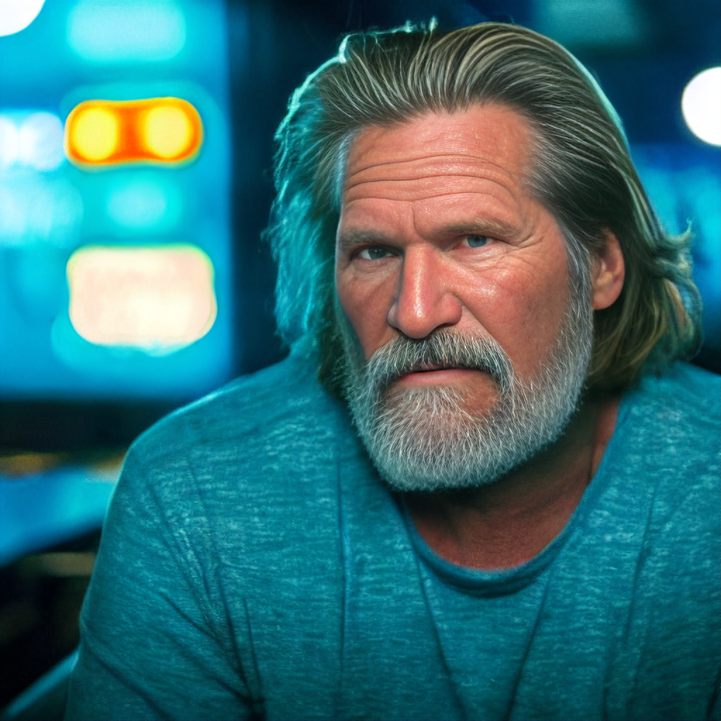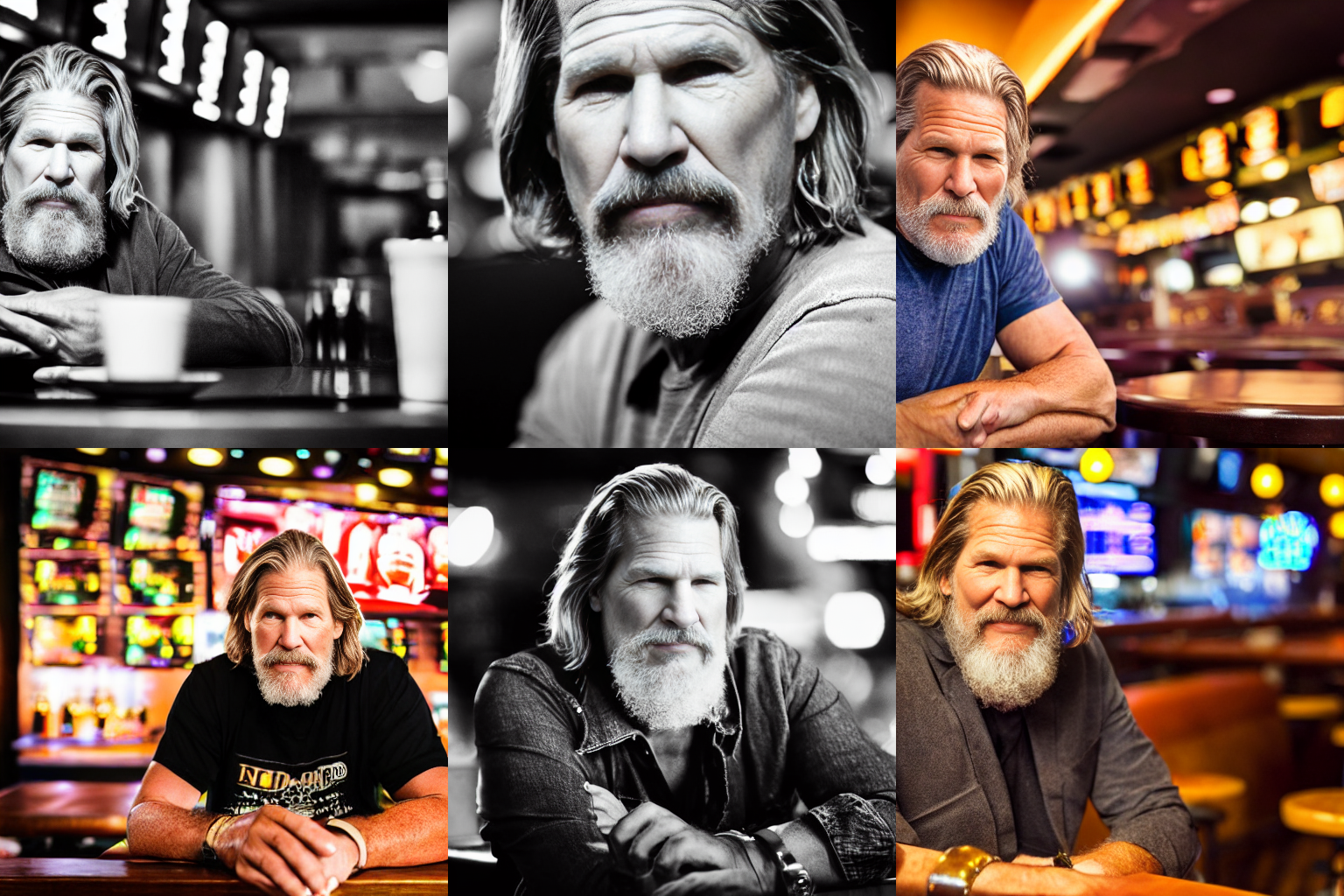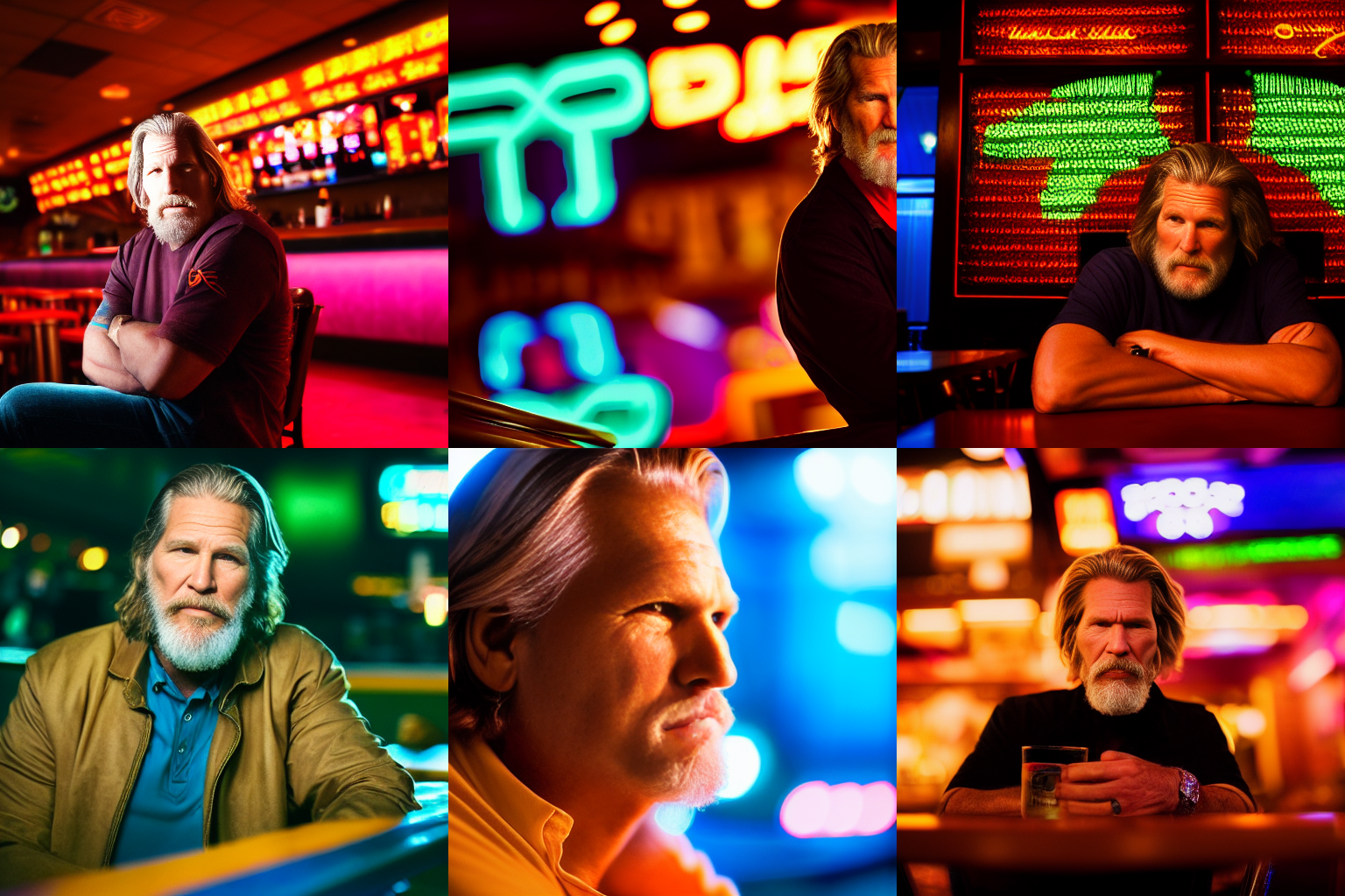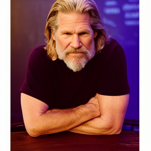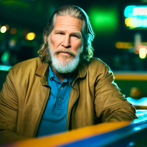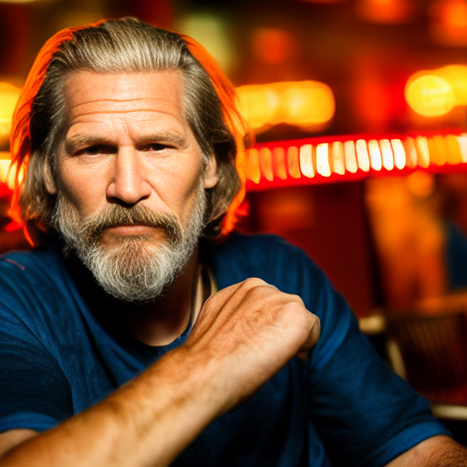 A portrait of Jeff Bridges sitting in a late night sports bar. Natural colors. Detailed face, detailed skin, detailed texture, detailed cloth, crisp, high detail, very detailed, hyper detailed, high-res, 4k, 8k, 8k texture, super resolution, ultra detailed, fine texture skin, fine texture face, photo, restoration. Mild contrast, natural contrast, natural light, good lighting. Hands.