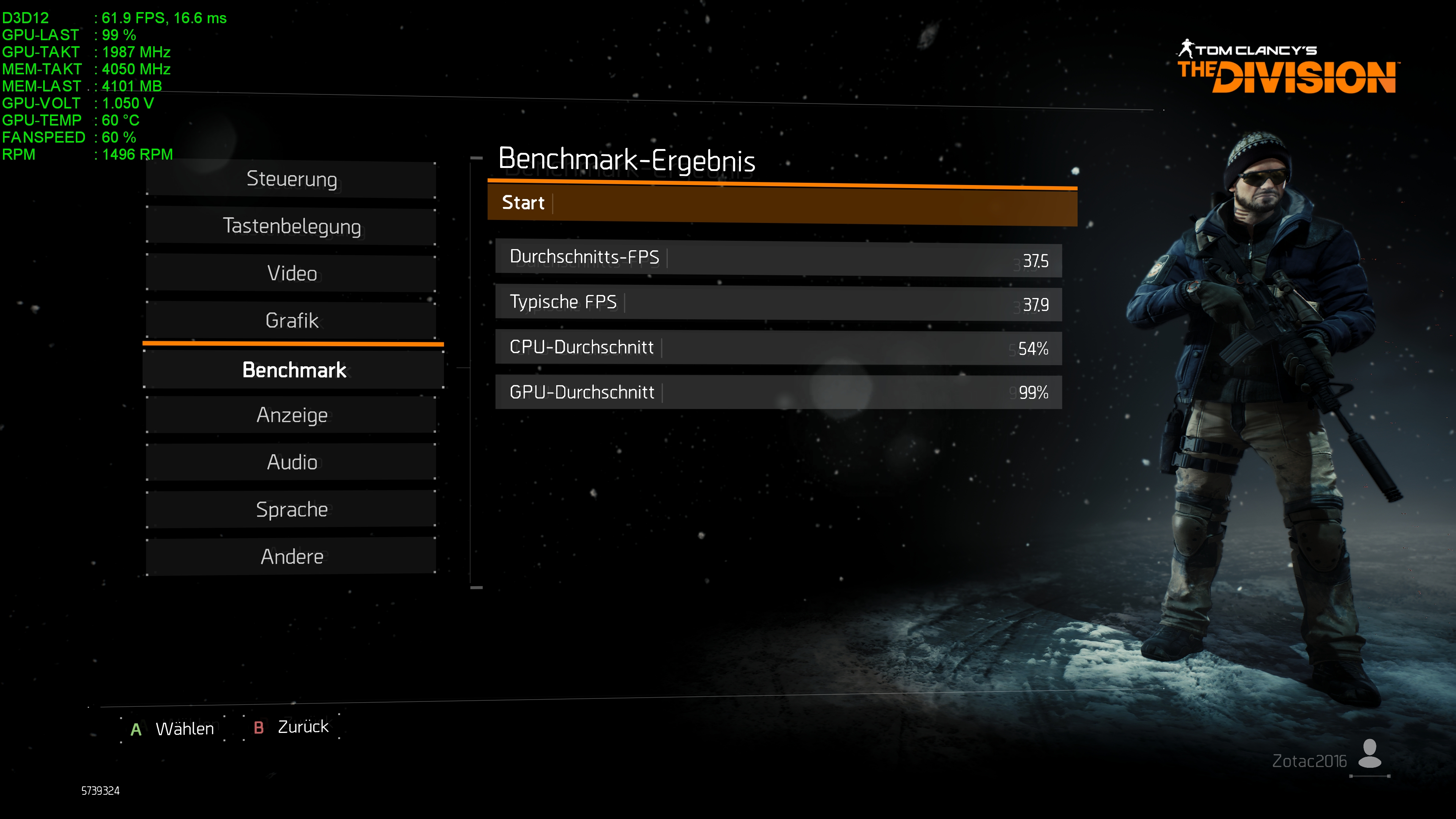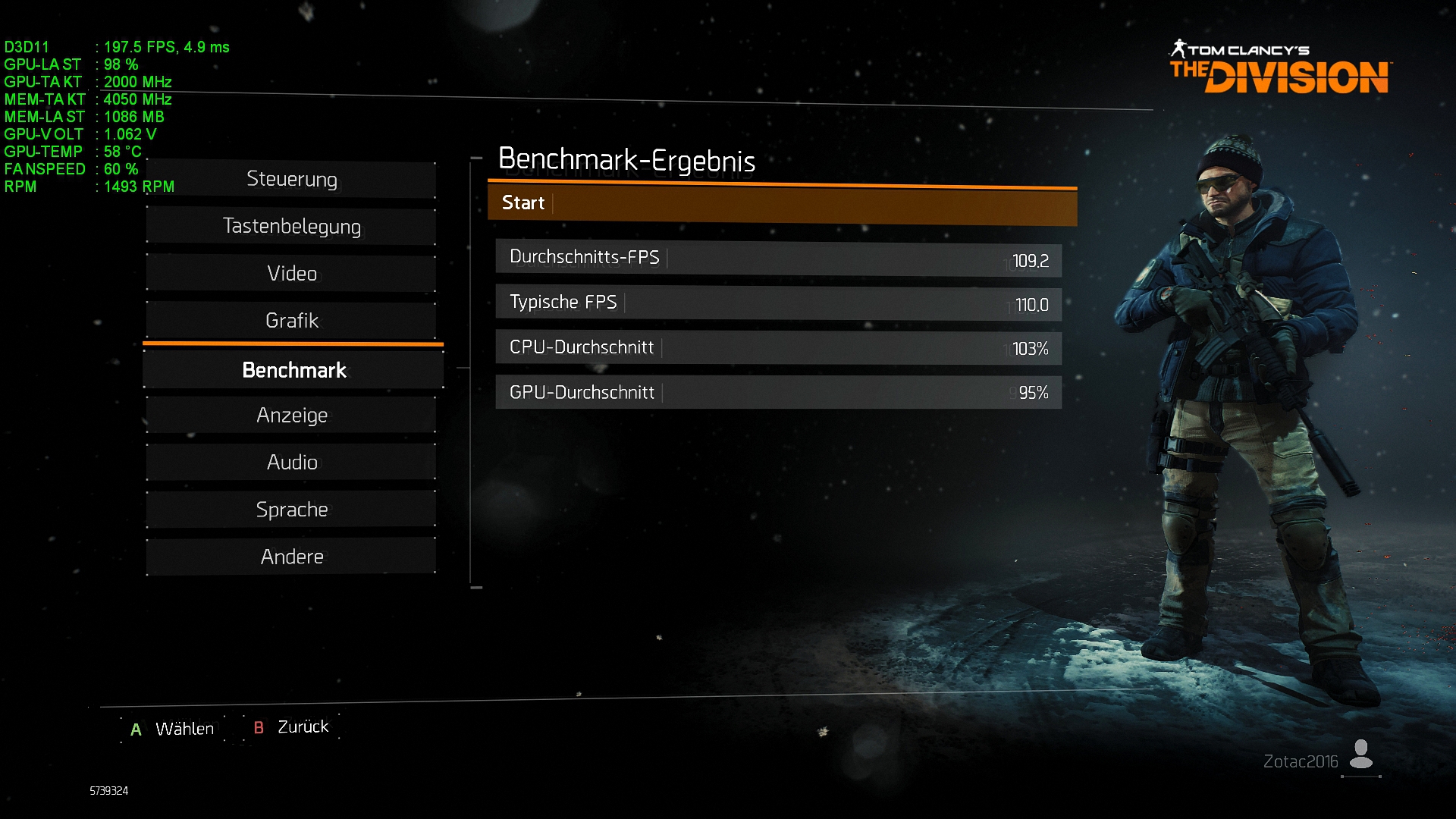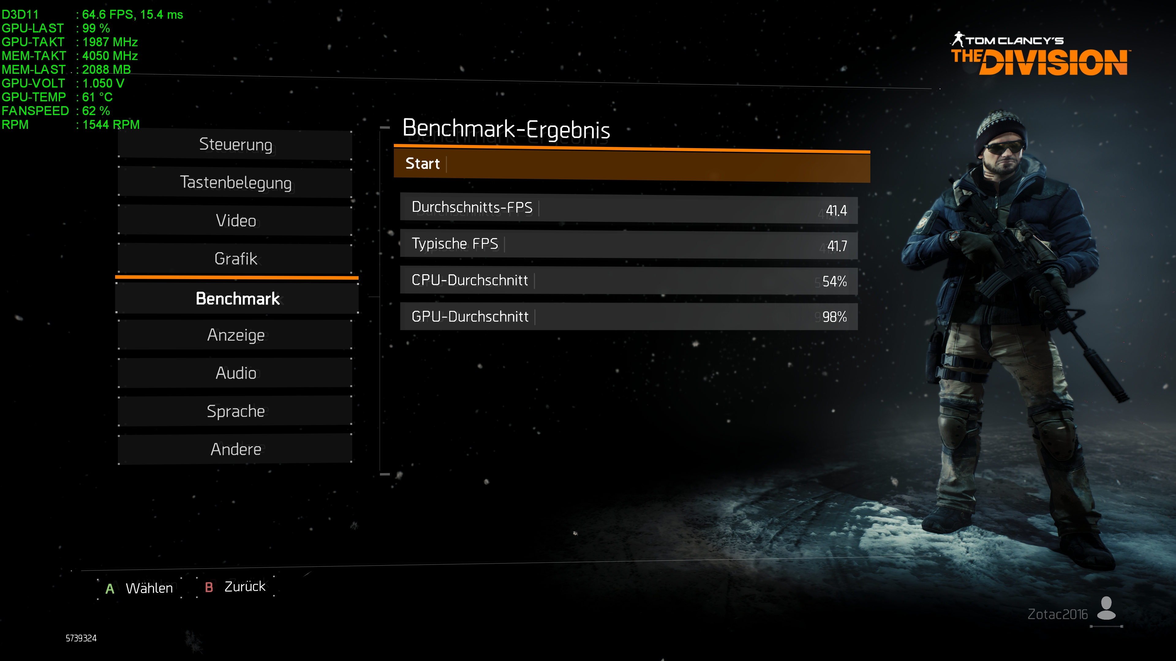 Außer das ich Vsync aus und Framerate Begrenzung abgeschaltet habe wurde im Menü nichts verändert, bei der von The Divsion vorgegebenen High einstellung!
