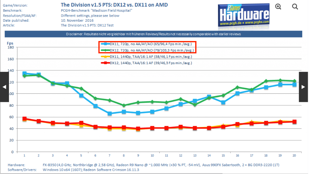 jeweils mit 1 x FuryX und Xeon E3 1230v3. Unter DX12 funktionierte Crossfire noch nicht,daher mit einer Karte gemessen, mal sehen ob Crossfire zukünftig unter DX12 in the Division möglich ist.