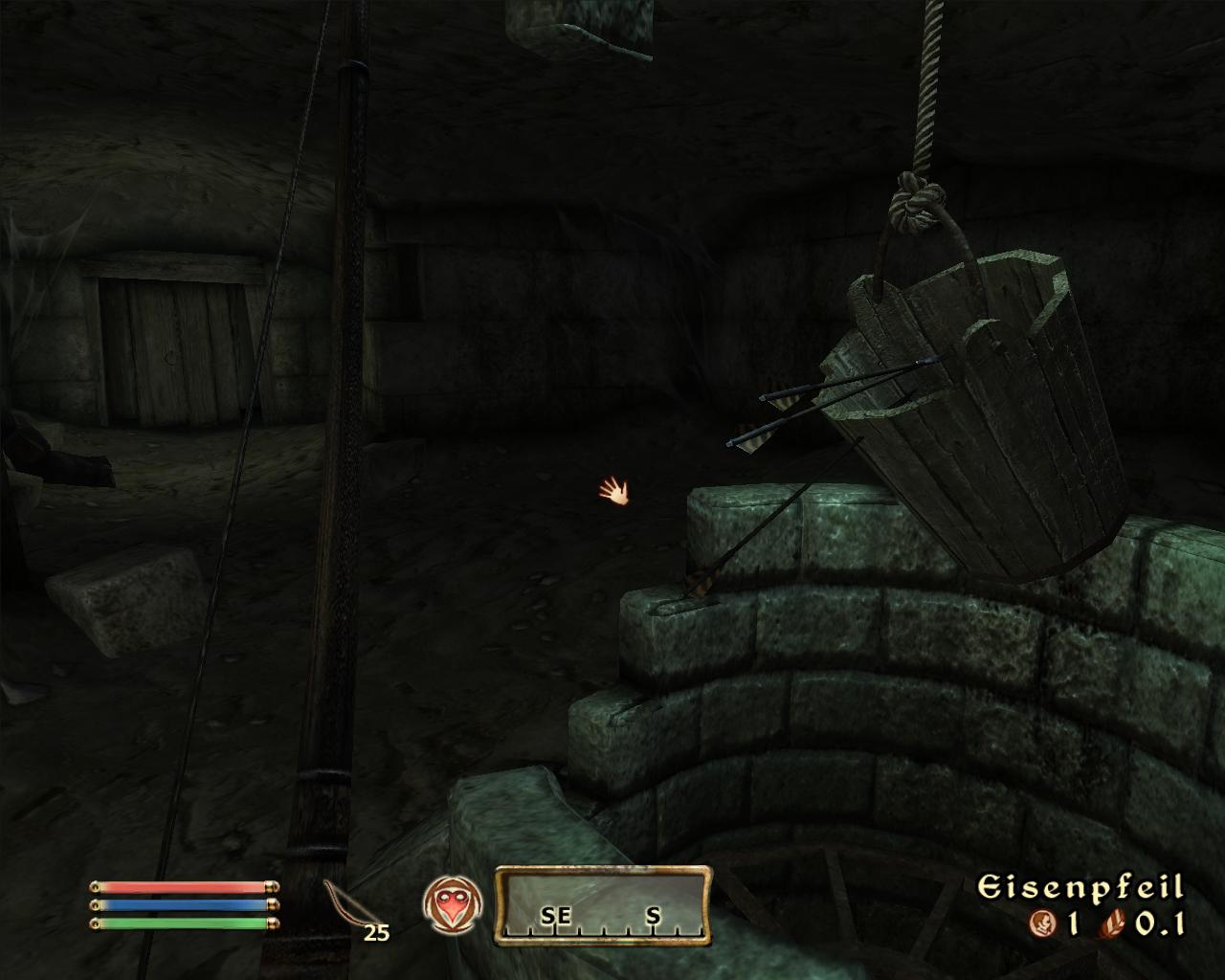 Die Waffen zu schwingen ist absolut erstklassig gemacht, der Bogen der Hammer, weil die Pfeile physikalisch korrekt fliegen. Also höher zielen, je weiter etwas weg ist. In einer Höhle gleich mal auf einen Eimer geschossen. Der Clou: Die Pfeile stecken so drin, wie sie einschlagen und man kann sie wieder mitnehmen. Der Eimer hängt natürlich entsprechend, wenn ein paar Pfeile mehr eingeschlagen sind.