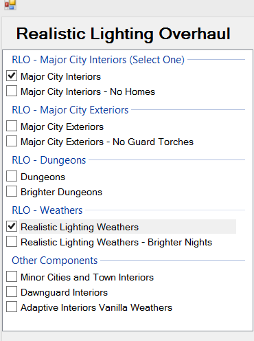 Und ja, ist RLO installiert kannst du durch aktivieren der entsprechenden .esp dazu nehmen was du möchtest. Aber darauf achten: Entweder RLO oder ELFX nehmen (beides sind mods für die Beleuchtung, daher nur eine davon wählen) und zu beiden mods kannst du das Wettermodul dazunehmen.