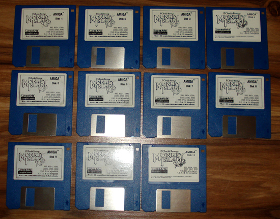 Die 11 Disketten bei der Amiga Version kommen dadurch zustande, weil der Amiga Laufwerksbedingt eine andere Spurdichte genutzt hatte. Zudem handelt es sich bei den auf dem Bild gezeigten Disketten um DD-Disketten, zu erkennen an nur einem Kennzeichnungsloch. Der Amiga konnte auf diesem Typ bei zweiseitiger Nutzung 880 KB schreiben, was einiges weniger ist das der PC mit HD-Disketten konnte (1,44 MB).