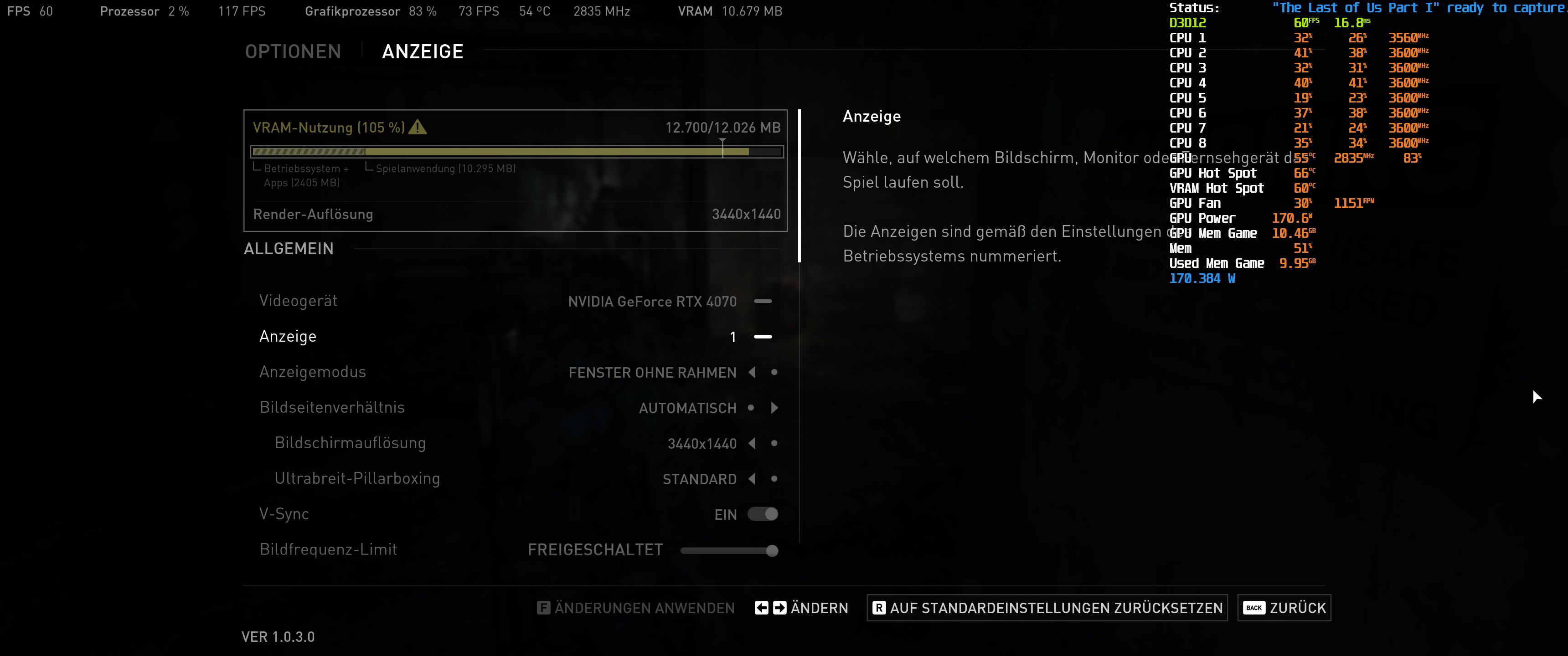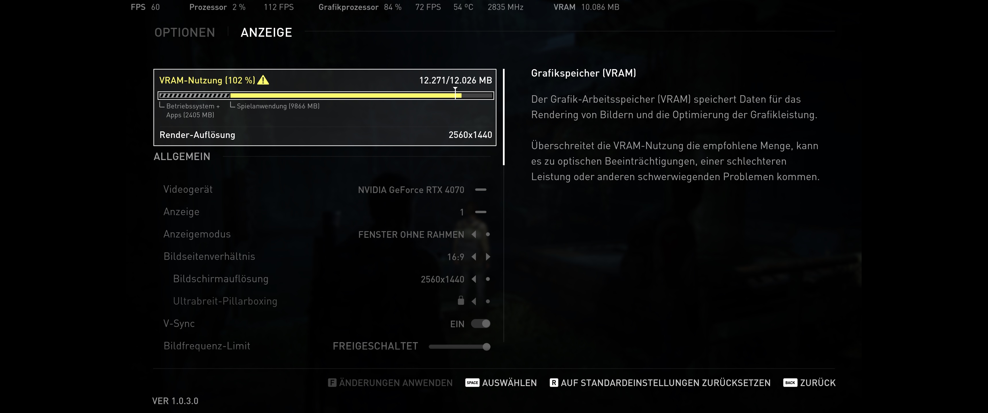 Bei der 6700XT stand im Menü über 13GB (UWQHD, nativ). Das Overlay vom Spiel zeigt immer weniger an als in den Einstellungen, wüsste auch nicht wozu das System 2,4 GB VRam nutzen sollte wenn ein Spiel läuft.argh00 schrieb:Im (U)WQHD wenn du da alles auf Max drehst, zeigt er ja ingame im Einstellungsmenu was zwischen 13-14 GB VRAM an.