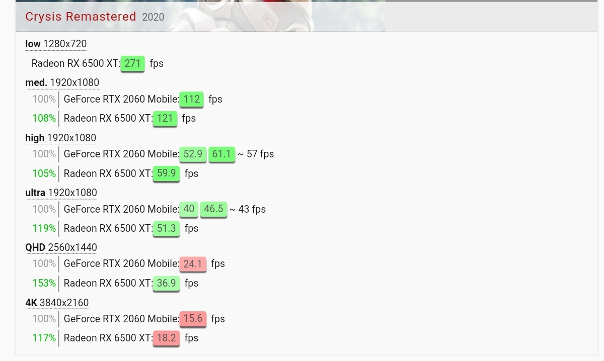 Wow hab mir benchmark angeschaut echt nicht schlecht aber am witzigsten fand ich crysis genialMelmoth schrieb:Vielleicht hätte ich schreiben sollen meine 6500XT, und ja, nach den Berichten hier von Besitzern mit richtig potenten Karten hatte ich mit heftigen Problemen gerechnet, aber es lief halt von Anfang an ohne größere Probleme, nur eben mit vorrangig mittleren und niedrigen Einstellungen.