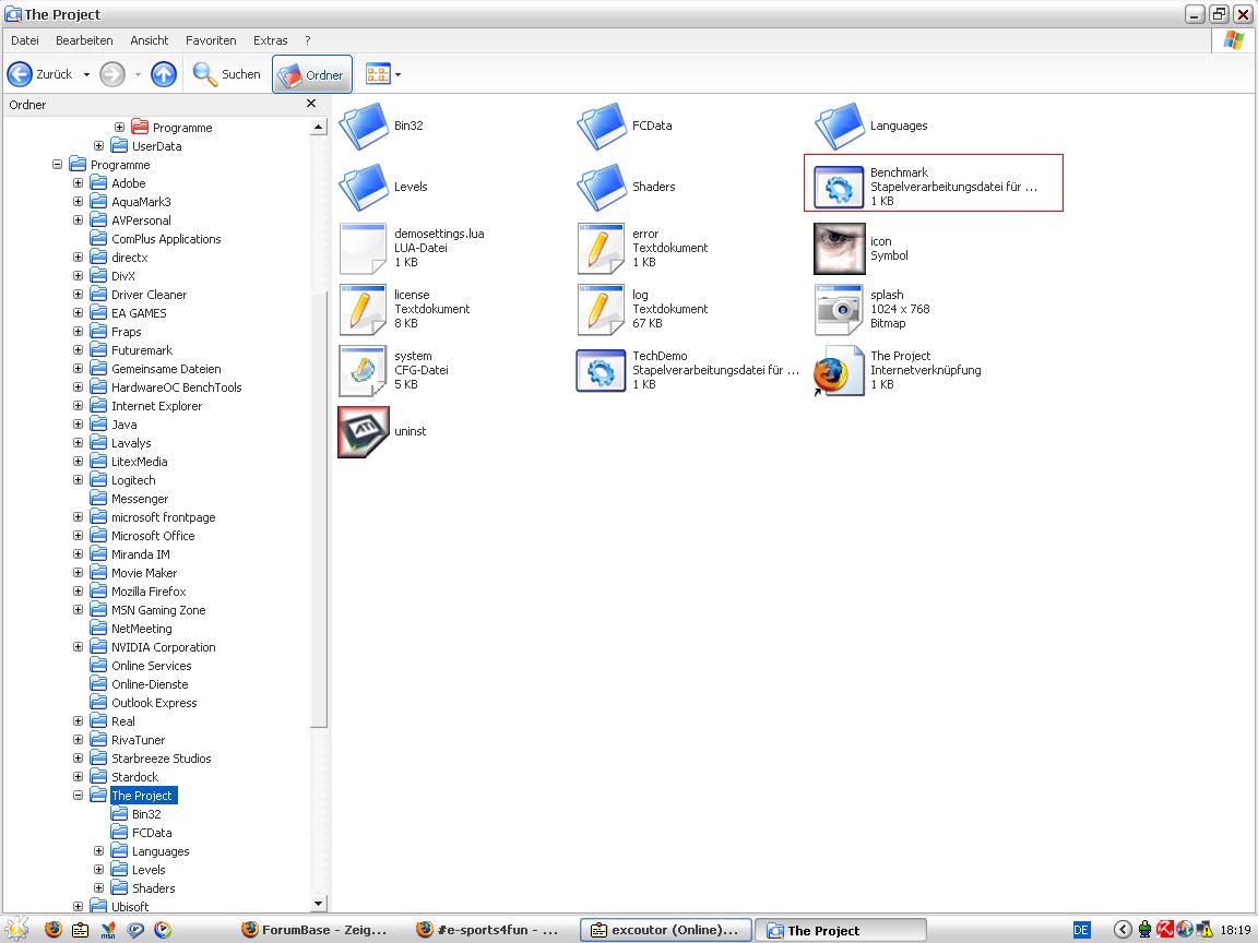 Im Installationsverzeichnis (Programme -> The Project) befindet sich eine Benchmark.bat Datei (da steht nur Benchmark, ist aber eine .bat Datei). Darauf doppelt geklickt startet den Benchmark. Nun noch Auflösung und AA eingestellt und los gehts.