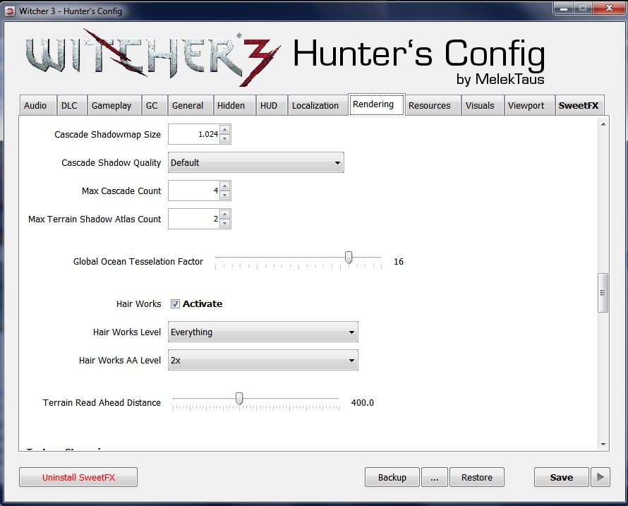 Gute MOD die eine fehlende Einstellung ergänzt. Ich habe Hairworks vorher auch ausprobiert. Aber gerade in Räumen war es nicht zu gebrauchen von der Perfomance her. Obwohl ich in der .ini den Wert auf 2 ersetzt hatte. Mein System ist eh ein weng schwach dafür (AMD x4 840, GTX750). Aber zumindest außen war es ganz brauchbar.