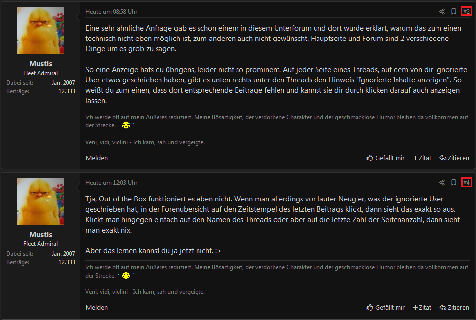 Es wird auch kein wirklich sichtbarer Hinweis angezeigt, dass man ein Thema eines ignorierten Benutzers betrachtet.