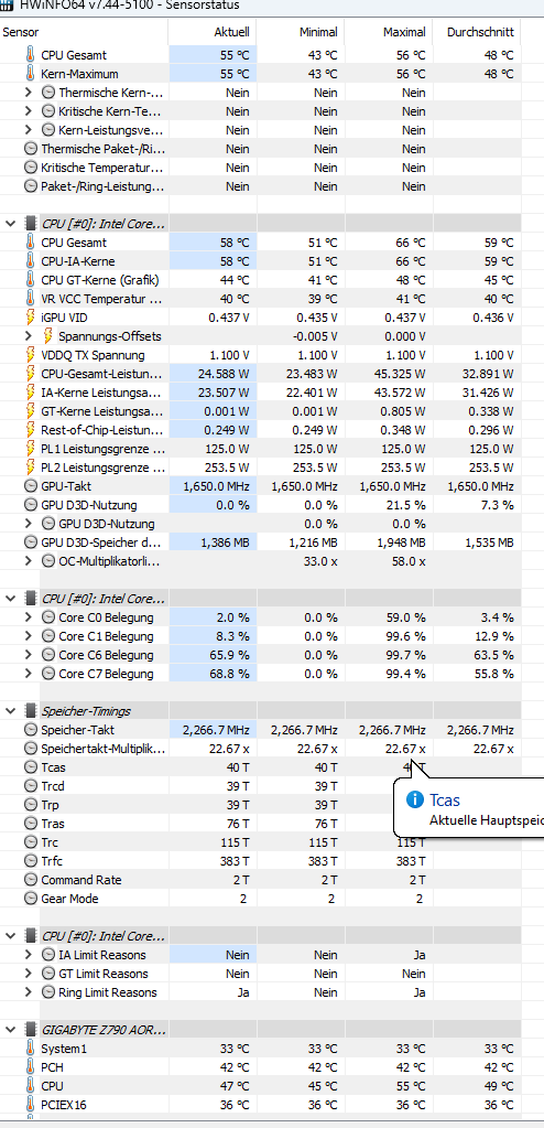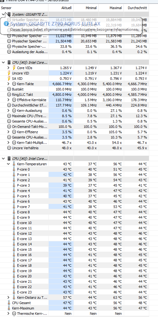 Ich habe gestern von AMD auf das oben beschriebene System umgebaut. Nach dem ersten Start lief die CPU immer auf 100grad. Wenn nichts im WIN11 geöffnet liegt so bei 44grad. Wenn ich aber nen Programm starte oder gar den MSFS2020 starte und betreibe ist die CPU immer bei 100grad und aktiviert natürlich Thermal Throtteling. Ich meine das die Temp. bei der CPu schon ziemlich weit oben liegt scheint bekannt aber das egal welche "Last" auf der Cpu liegt die Temperatur immer nach oben schießt und bleibt, scheint nicht normal.