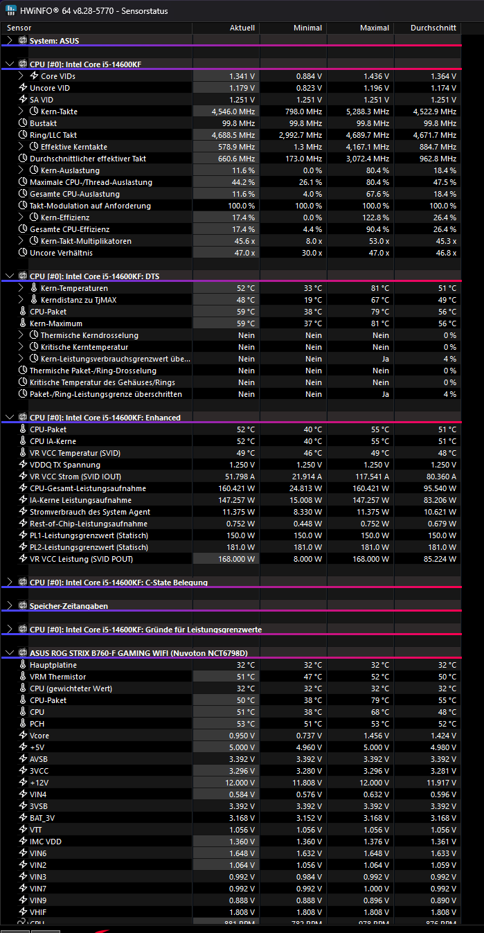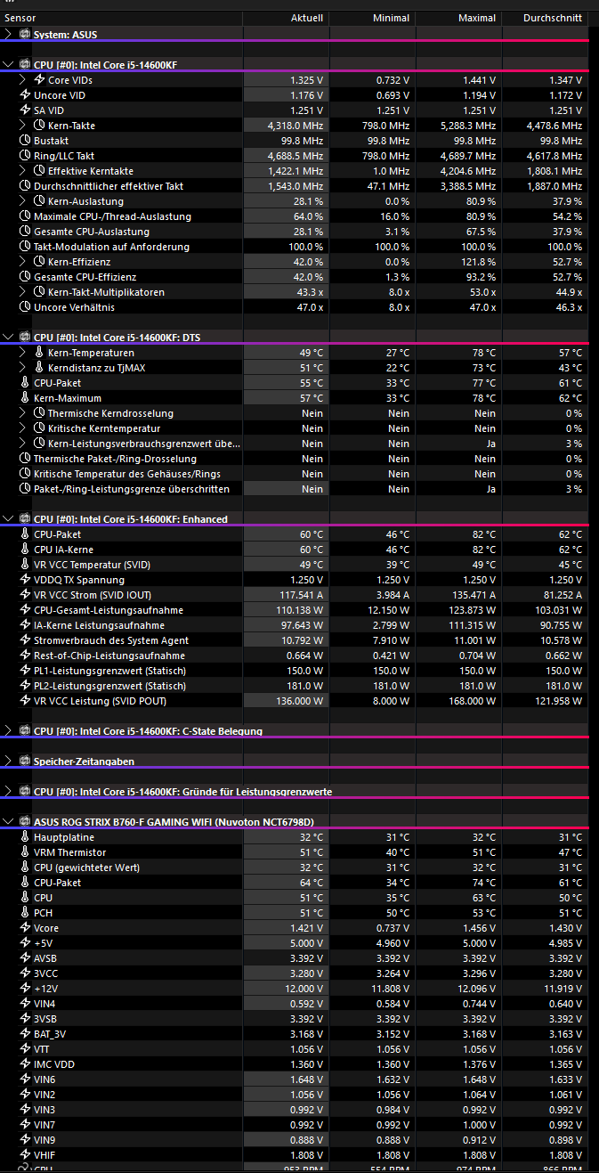 Ich habe mich einmal an den Versuch gewagt zu undervolten. Dabei habe ich bei Global Core SVID Voltage von -0,15V und ein Cache SVID Voltage von -0,05V. LCC auf Level 4. Ich habe das nur anhand von Tutorials gemacht, da ich mich selbst nicht genug damit auskenne. Ich habe es getan weil ich mit bios standard einstellungen ständig im thermal throtteling war. Im Bios war auf Standardeinstellungen eine Kernspannung im bios von 1,5V oder sowas.