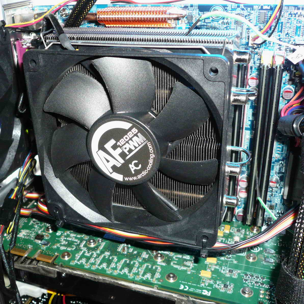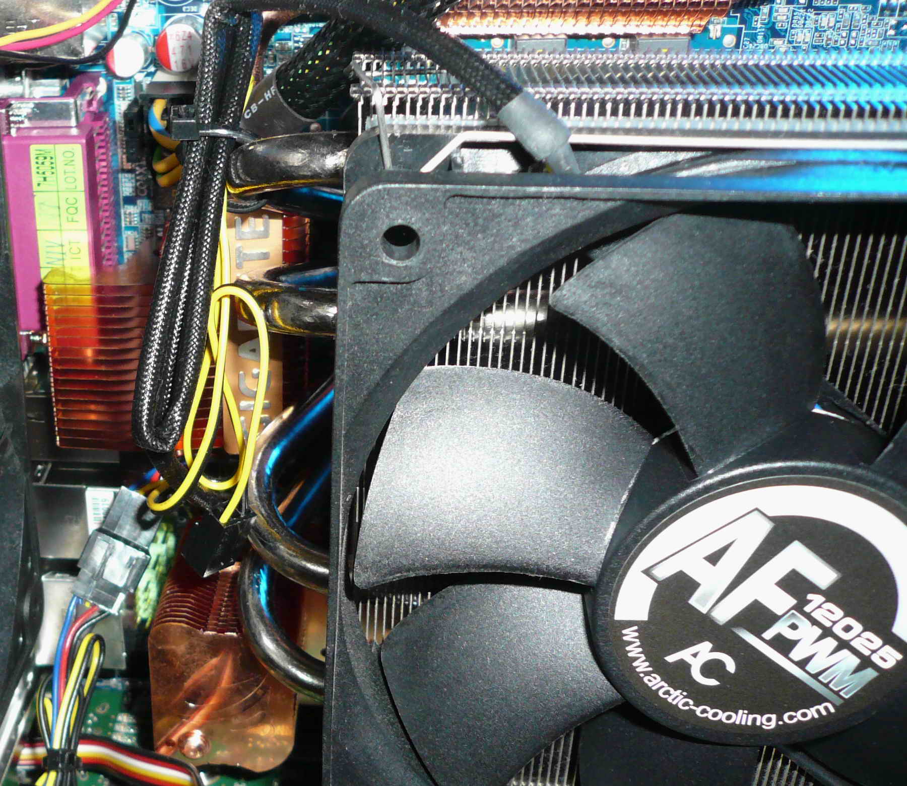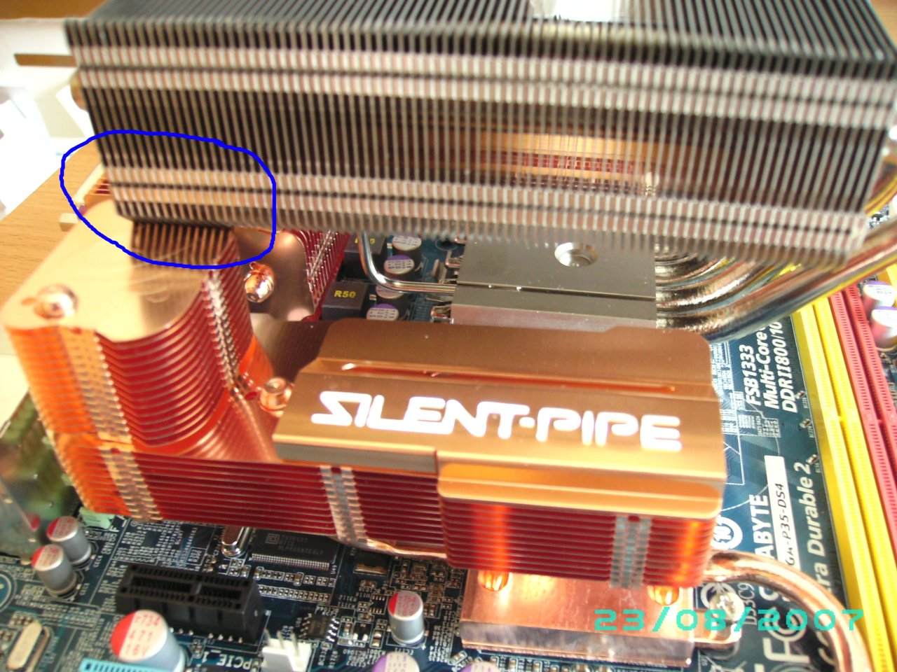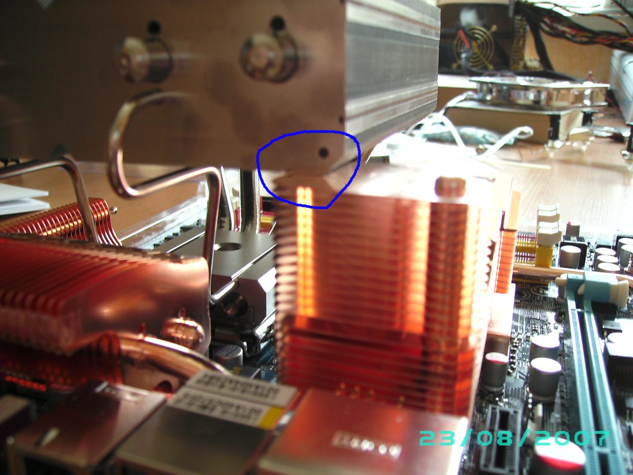 Der Kühlkörper scheint allerdings nicht zu passen, er stößt, egal um wieviel Grad gedreht ich ihn einbauen möchte, mit diesem kleinen Türmchen der Kühlkonstruktion des Mainboards zusammen. Bilder siehe Anhang.