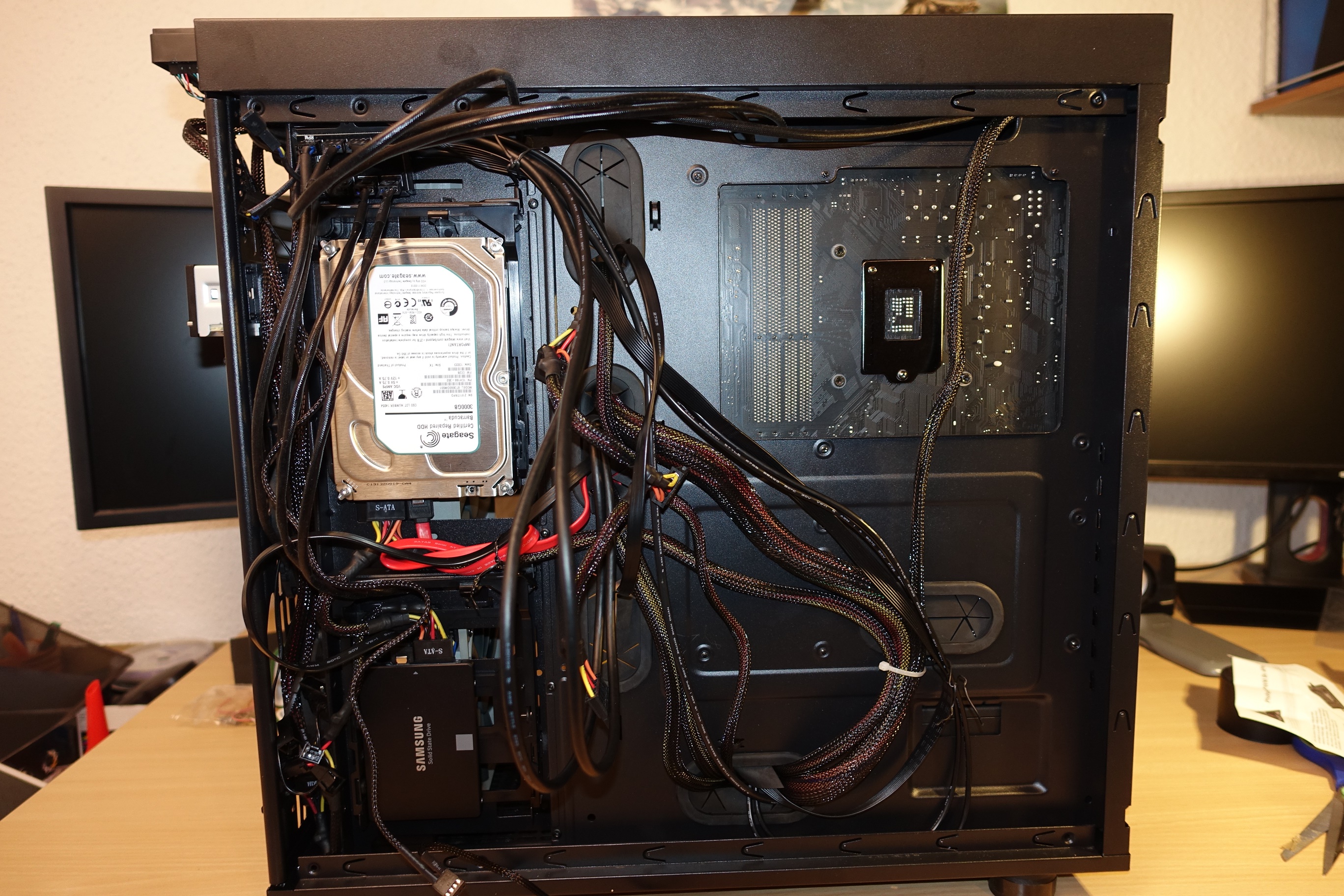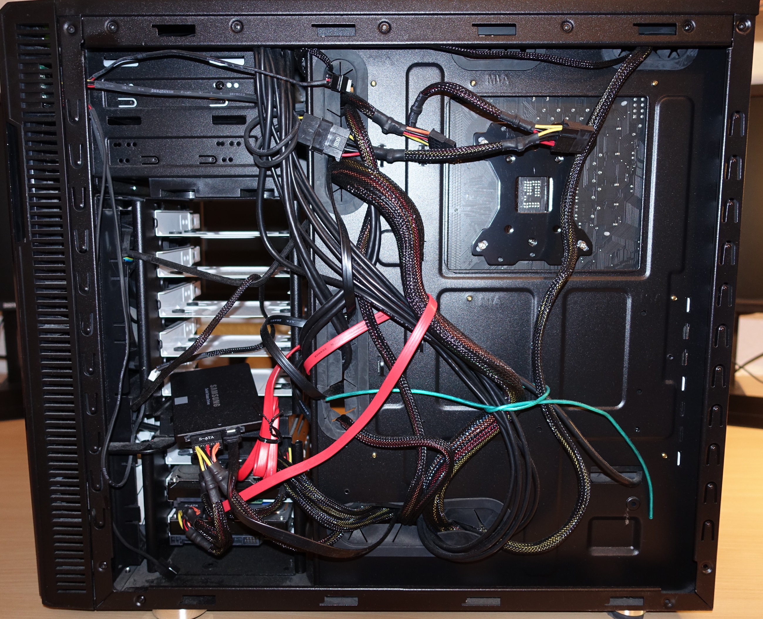 Ganz zum Schluss war die Enttäuschung groß und ich widmete mich erstmal dem (vorläufige) Kabelmanagement. Das dauerte auch ganz schön lange und Kopfschmerzen bereiten mir noch die Lüfter, da es nur wenige Optionen für eine geeignete Anbringung des PWM Hubs gibt, wie man auf den Bildern sehen kann.