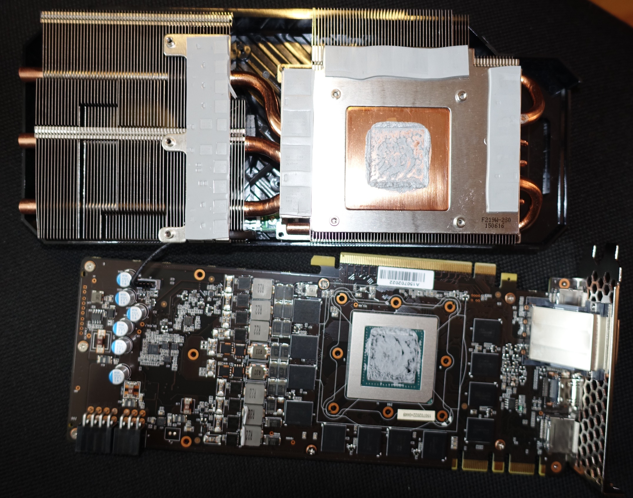 Das Installieren des CPU-Kühlers war ein Kinderspiel. Der Umbau der Grafikkarte hingegen stellte sich als schwieriger heraus, als ich dachte. Bei etlichen Anleitungen kann man beobachten, dass das Entfernen des Kühlers das Lösen der meisten Schrauben auf der Rückseite der Karte erfordert. Nur zu dumm, dass bei meiner Palit 980ti Super Jetstream die Hälfte der Schrauben von der Innenseite angeschraubt sind. Ist doch egal, dachte ich mir. Ich schraube eben nur die Schrauben ab, an die ich komme. Ich wusste, dass die Wärmeleitpaste klebt und rüttelte so fest ich mich eben traute an dem Kühler, aber es passierte nichts. Da ich die Karte durch zu festes Rütteln kaputt machen wollte, suchte ich im Netz nach Infos zum Kühlerwechsel bei meiner Karte - vergebens. Ich fing nun wie bescheuert an, andere Schrauben am Kühler zu lösen. Langsam kamen mir Zweifel, da schon in der Alphacool Kompatibilitätsliste mein Modell nicht aufgeführt war, weshalb ich ja vorsichtshalber zum EK Kühler gegriffen hatte. Auf einmal löst sich der Kühler wie von selbst und mir wird bewusst, dass tatsächlich die WLP und die klebenden Wärmeleitpads für die Spannungswandler die ganze Zeit über so stark hafteten und meine ganze übertriebene Demontageaktion für die Katz war.