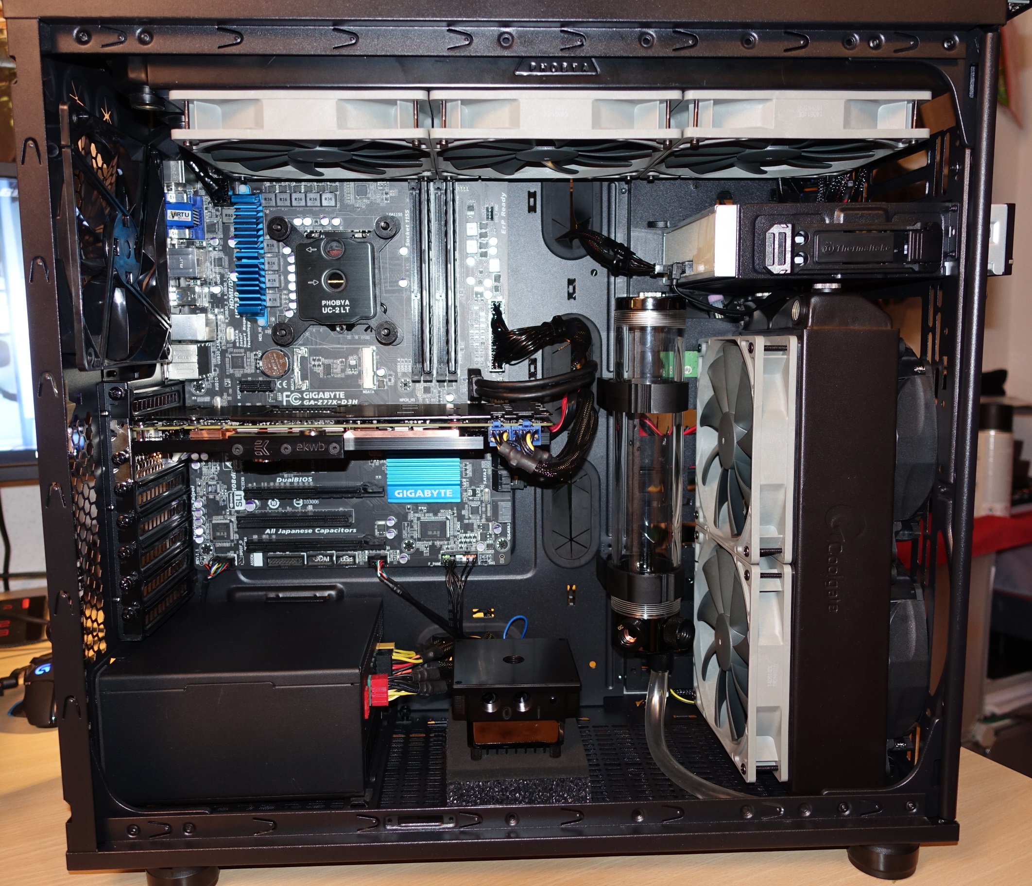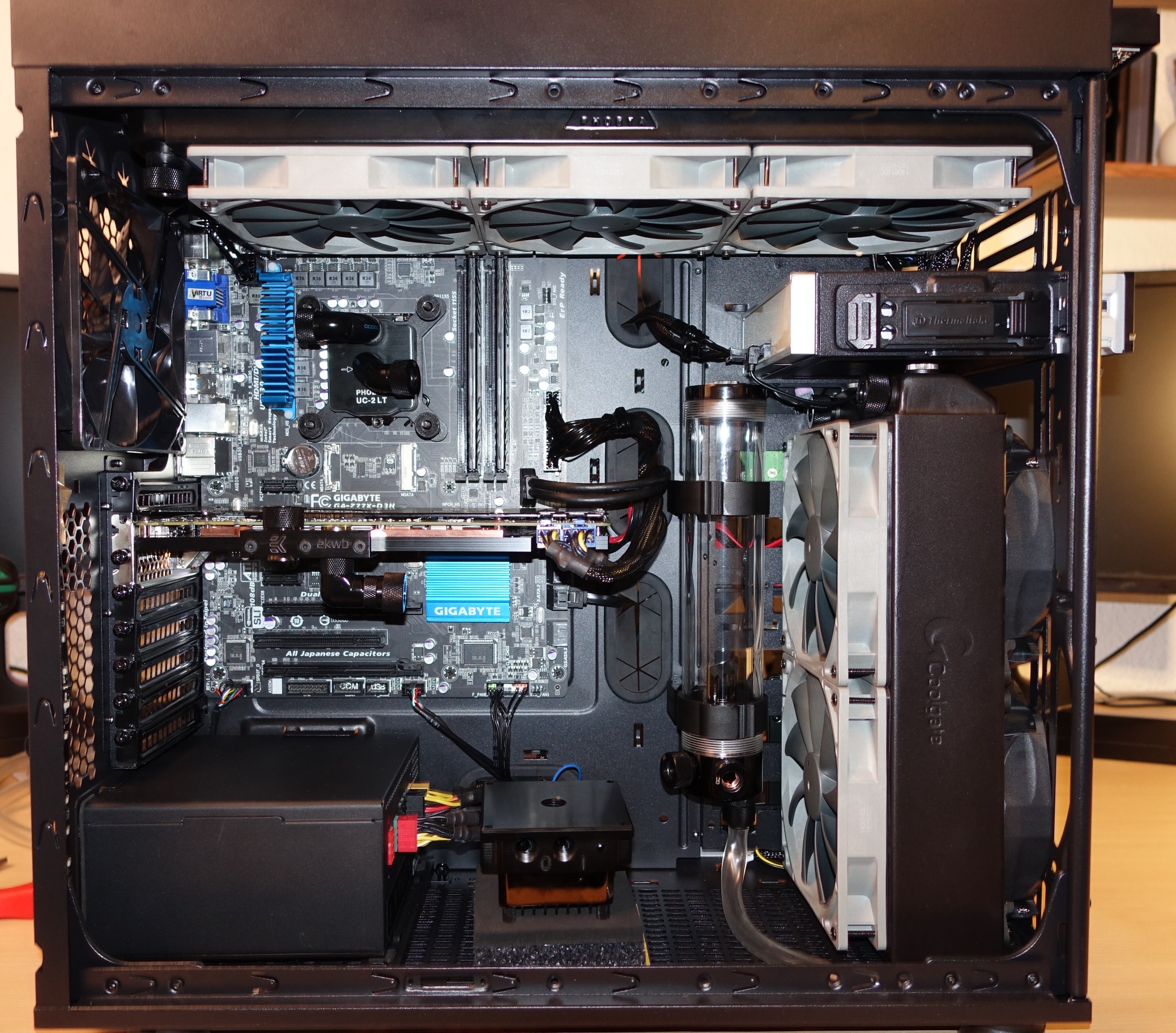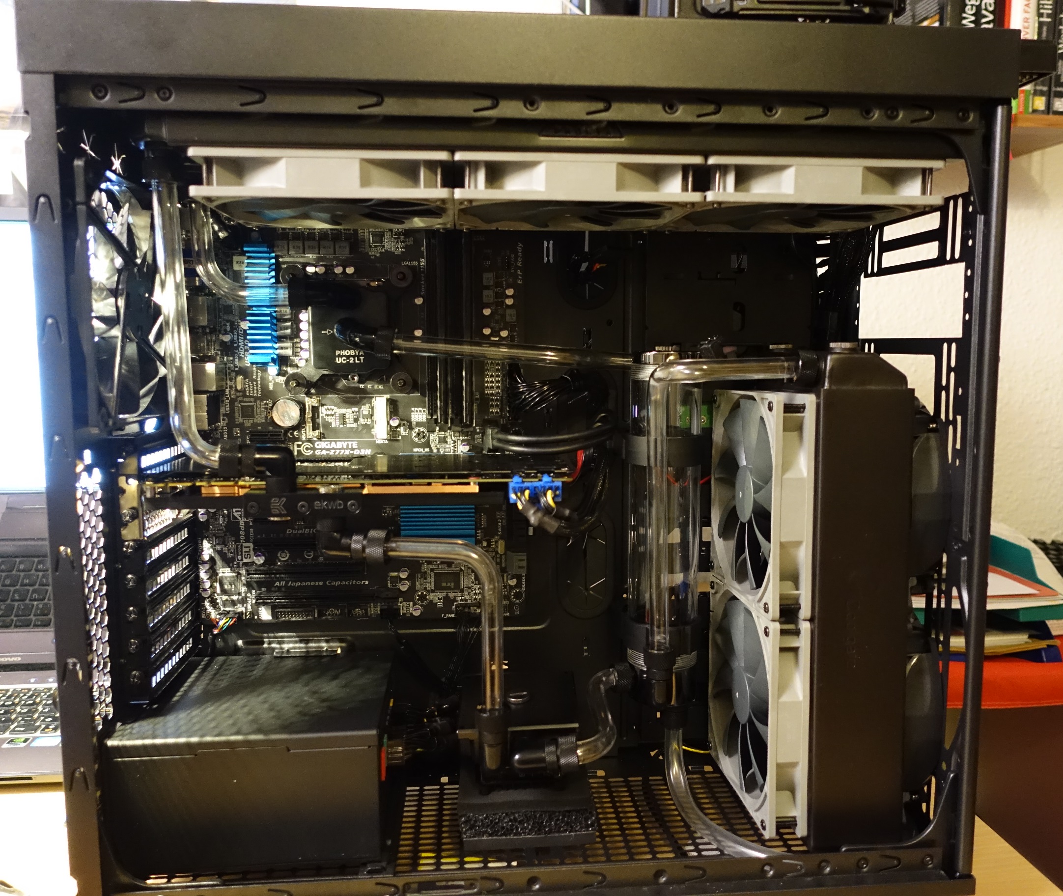Vergessen zu erwähnen hatte ich noch, dass ich 2 Alphenföhn PWM Lüfter über hatte, die ich dann nachträglich vorne an den Radiator schraubte. Die Luft soll hinten angesogen werden, und jeweils oben und vorne raus gehen. Entsprechende Staubfilter gedenke ich hinten noch anzubringen.