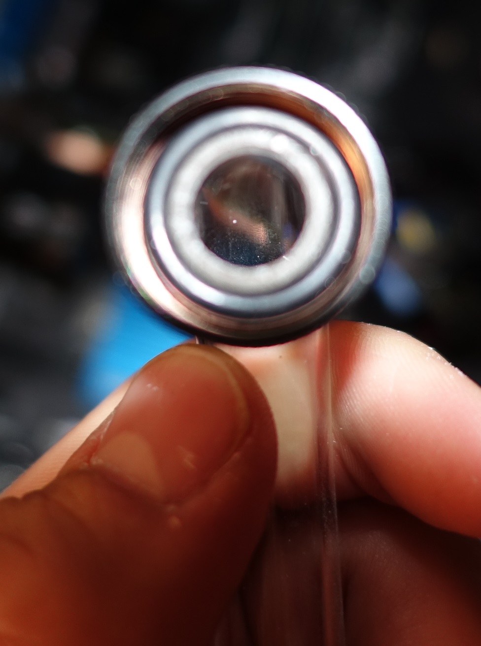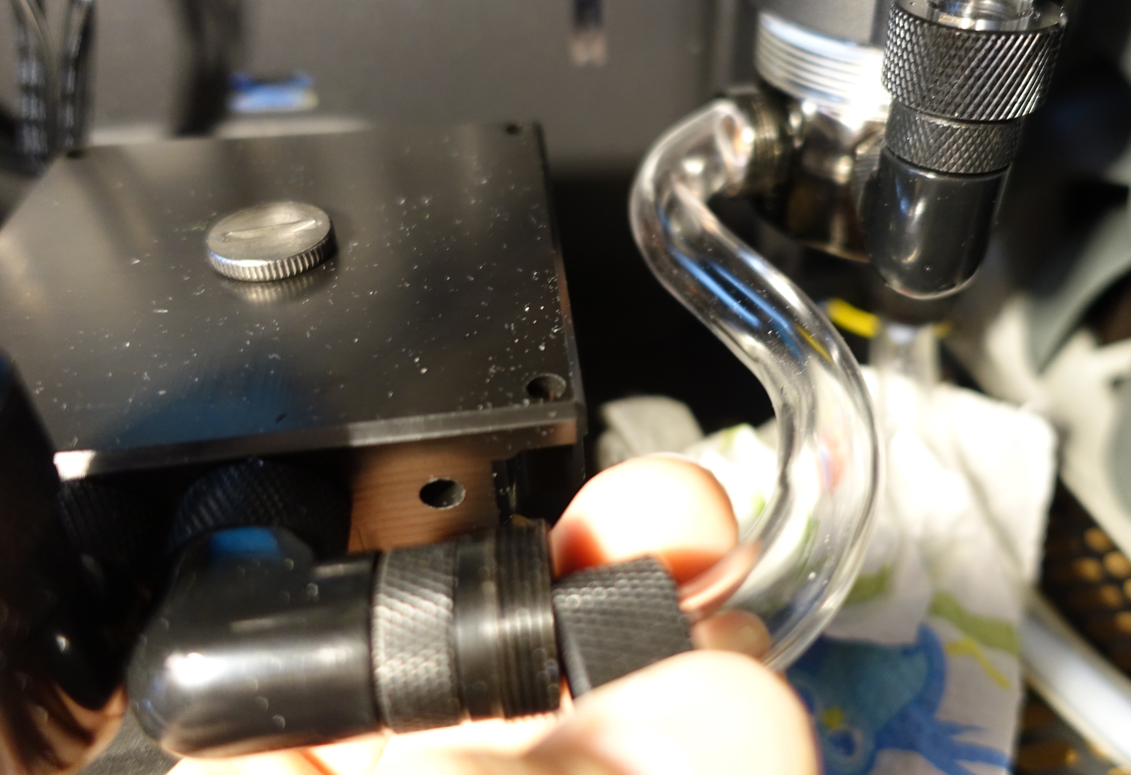 Ausgerechnet beim Montieren des Wasserkühlers unterlief mir dann ein böser Fehler, weil ich es am Samstag abend eigentlich keine Zeit mehr hatte und es bei mir daheim hektisch zuging. Dem EK-Kühler lagen zwei Schraubentypen bei, und ich verwendete versehentlich die minimal längere Schraube, die ich ohne es zu merken fest in den Kühler drehte, da sie noch deutlich rausstand. Als mir das Malheur dann bewusst wurde, versuchte ich vergebens, die Schraube wieder rauszudrehen. Ich dachte, ich hätte die Schraube überdreht, weshalb sie nicht mehr raus kam. In Wahrheit aber wurde die Fassung, in der die Schraube steckte, anstelle der fest sitzenden Schraube aus dem Kühler rausgedreht (siehe Bild) - relativ spät merkte ich das, als diese Fassung schon gegen die Karte drückte und bereits eine gefährliche Biegung in der Karte zu sehen war. Ich musste dann mit einer Zange ran und durch die enge Lücke zwischen Karte und Kühler die Fassung fixieren, dann klappte es erst mit dem Herausdrehen der Schraube. Also alles in allem ziemliches Pech und natürlich auch Dummheit, denn es wäre sicher nicht passiert, wenn ich es auf Sonntag verschoben hätte und das ganze sorgfältiger angegangen wäre. Aber der Eifer war eben groß und ich wollte unbedingt die Karte zu Ende bringen