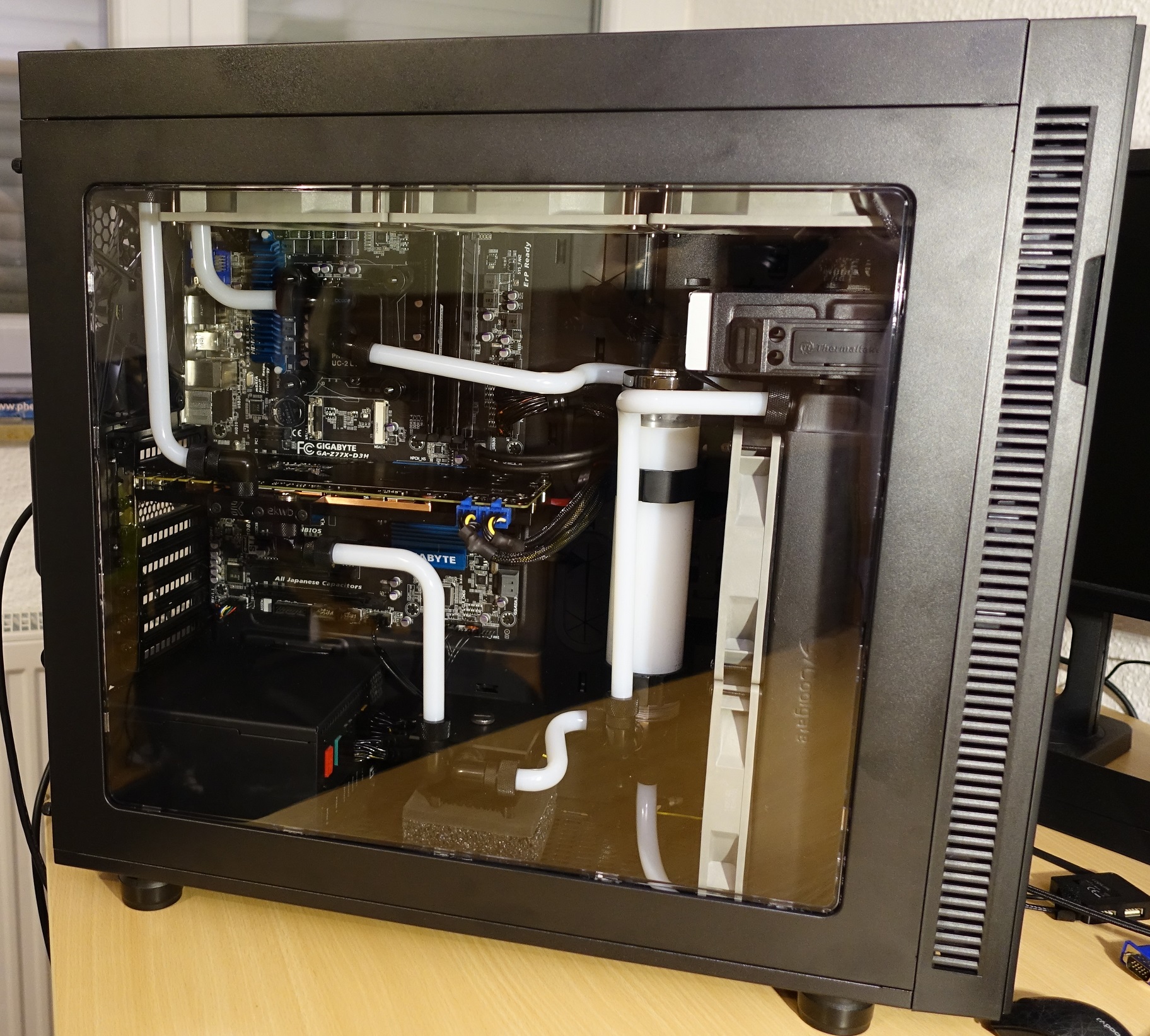 Das Zwischenergebnis ist meines Erachtens noch kein richtiges Zwischenergebnis, da das Sleeving komplett umsonst war und es fehlt ja auch noch der Großteil der Wakü. Aber positiv sehe ich, dass mir wahrscheinlich noch die nächsten zwei Wochenenden nicht langweilig werden kann