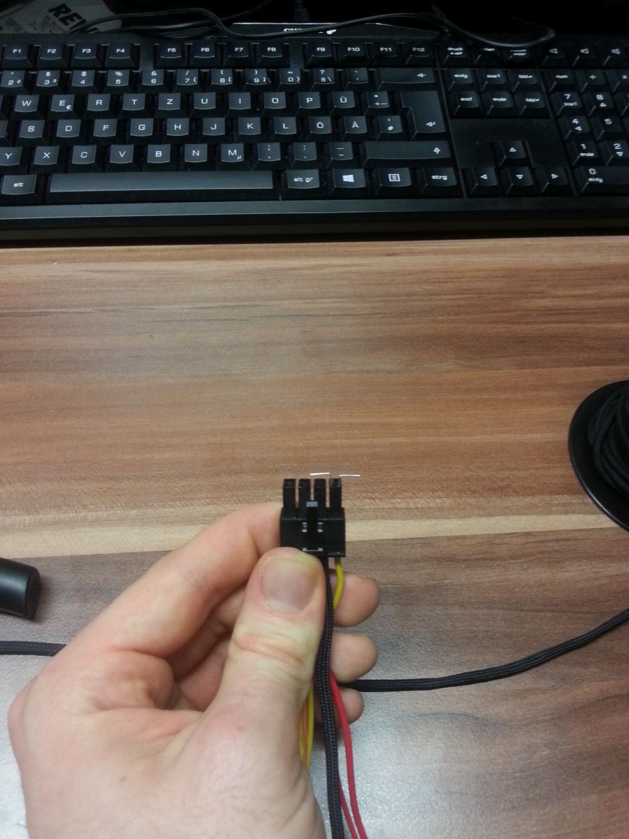 Das Sleeving kostete mich schließlich am Sonntag meine Nerven und meine Fingerkuppen. Im Forum wurde erwähnt, das Entfernen der Molexstecker ginge durchaus mit einer Tackerklammer. Die ersten Versuche waren da eher demotivierend, woraufhin ich es mit den schmal gefeilten Enden zweier Büroklammern versuchte. Das ging dann schon besser, dauerte aber trotzdem ziemlich lange, da beide Klammerenden immer noch so breit waren, dass es viel Geschick erforderte sie in die kleinen Lücken zu schieben. Ich musste trotzdem relativ stark an den Steckern ziehen, bis sie nachgaben. Das Wiedereinführen der Stecker nach dem Sleeven war dann teilweise genauso mühselig. Ich habe das Gefühl, einige Stecker beschädigt zu haben, da sie nur mit Mühe wieder reingingen und dann teilweise nicht richtig einrasteten. 12 Stecker habe ich gesleeved und dafür fast 5 Stunden gebraucht... Bei allem Bastelspaß, beim nächsten Mal werde ich mir gut überlegen, ob ich nicht lieber fertig gesleevte Extensions kaufe