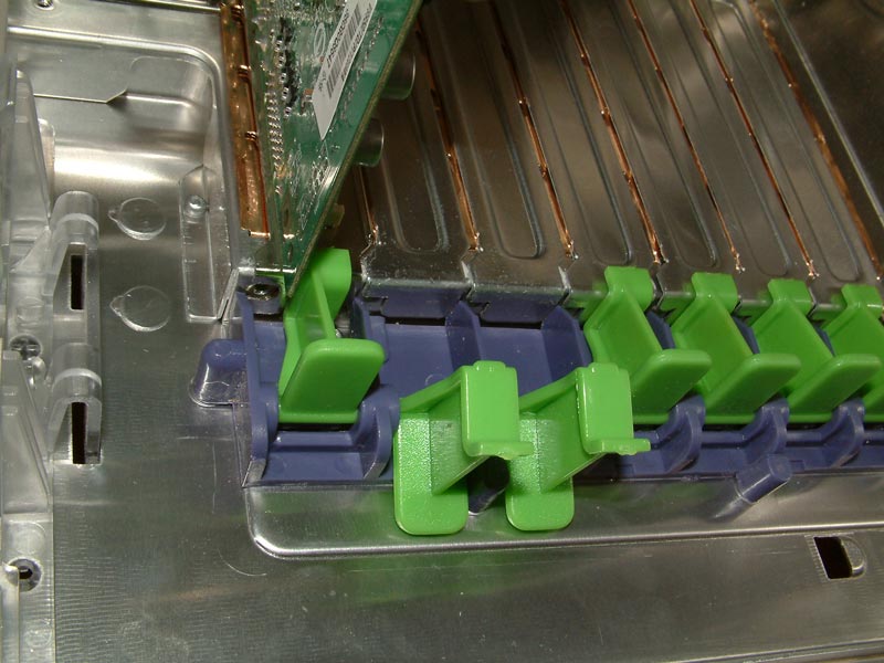 Aber hätte da noch eine Frage - Stichwort 'Schnellverriegelung für PCI-Karten' - wie sieht es da eigentlich aus mit Karten mit "Doppelslot-Blech" ? Bei meinem 'Review-Durchforsten' habe ich eine englische Seite gefunden, die behauptet hat, man könne keine Karten mit doppelter Bauhöhe einbauen. Eine andere Seite schrieb, dass man die grünen Plastik-Klemmen abnehmen kann und dann normal verschrauben kann....