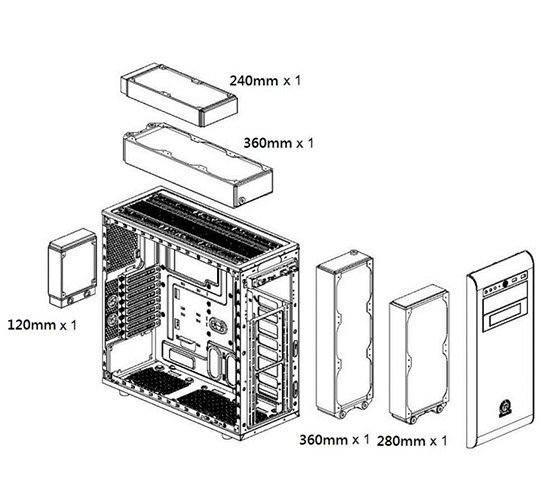 Laut dem Bild kann sowohl in der Front als auch im Deckel nur ein Radiator von bis zu 240 oder 360mm verbaut werden . .