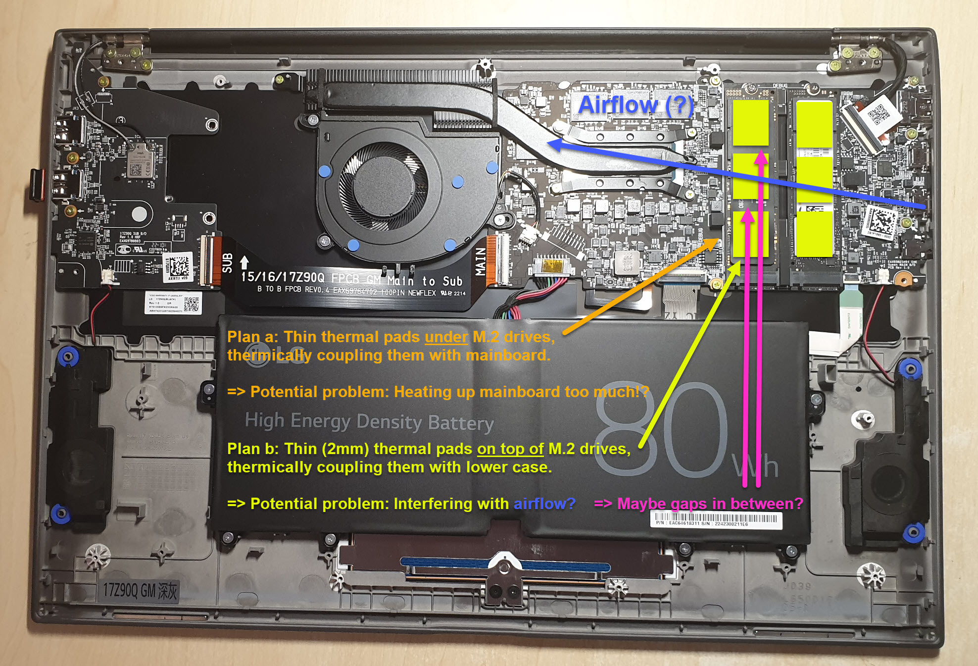Um die M.2s thermisch zu koppeln sowohl nach unten zum Mainboard als auch ans untere Laptop-Gehäuse (dünne Magnesiumlegierung oder so; sollte recht hohe Wärmeleitung haben).