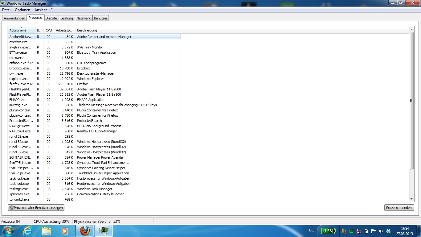 Mein ThinkPad läuft nun schon länger echt dürftig und ich dachte, es liegt einfach an dem NetBook selber aber nun habe ich festgestellt, dass die CPU nahezu komplett ausgelastet sind. bzw die CPU schwankt immer zwischen 20 und 80 %.