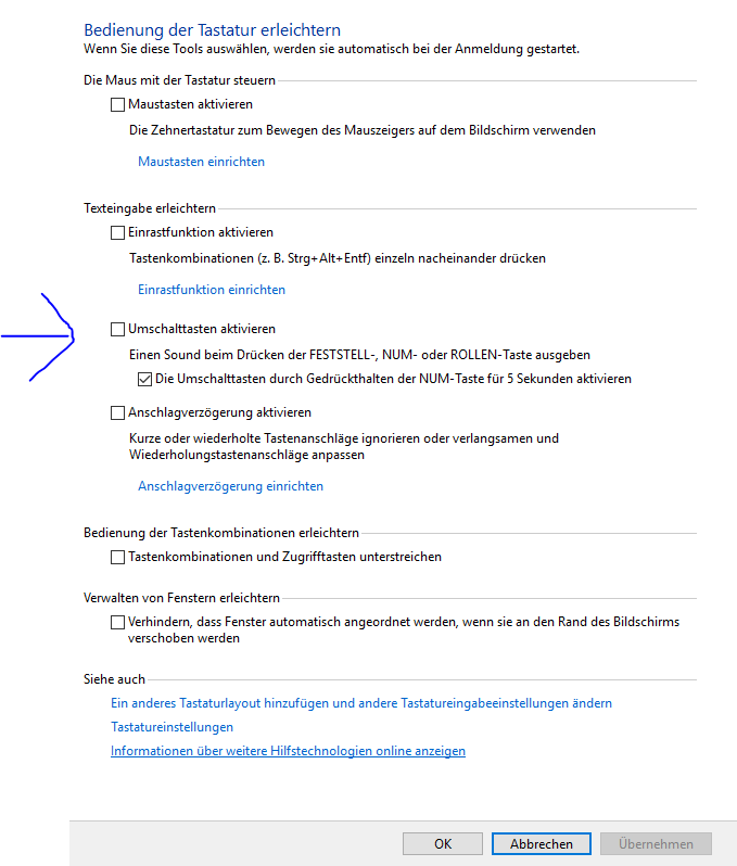 Sie können nun auf diesem Wege die Umschalttaste komplett deaktivieren. Dazu ist es lediglich notwendig, einen Haken vor "Umschalttaste deaktivieren" zu setzen.