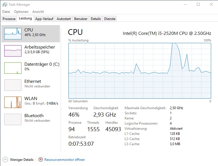 momentan benutze ich in gebraucht gekauftes ThinkPad T520 mit einem Core i5-2520M. Leider kommt es öfter mal vor, dass schon bei mehreren Browserfenstern und Word die CPU Auslastung auf 100% steigt und sich das System dann nicht mehr flüssig bedienen lässt.