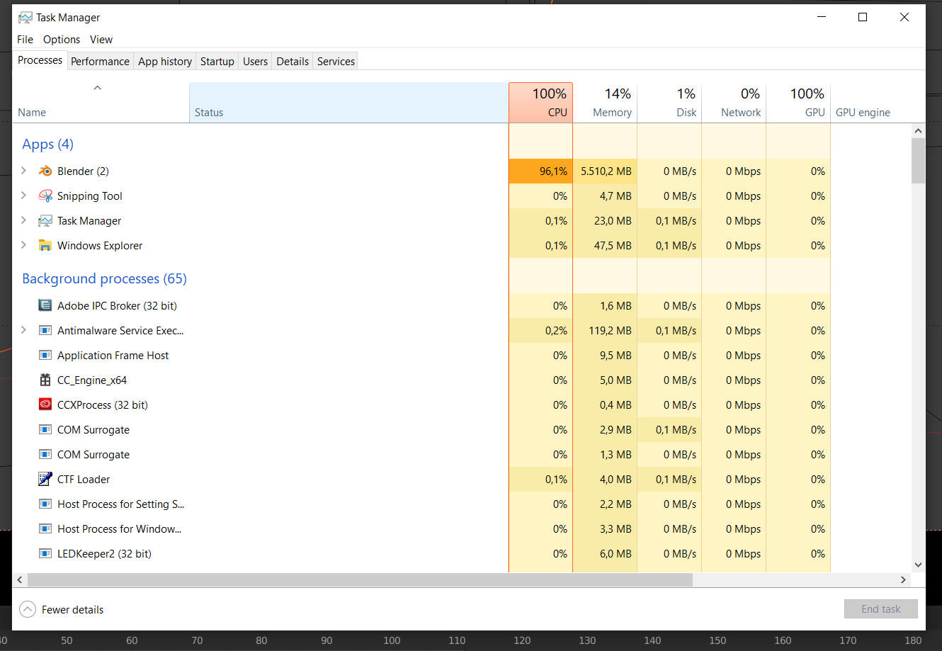 Wenn ich Animationen rendere ist meine CPU nach 10-20 Frames bei 100%, obwohl ich in Blender nur über die GPU render. Ist der Prozessor bei 100% angekommen bleibt Blender stehen und muss mit dem Task Manager beendet werden.