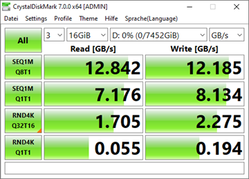 Zusätzlich ist in der Workstation eine Gigabyte Aorus AIC SSD NVMe 8 TB verbaut. Man muss hierbei des PCIe Slot x16 auf x4x4x4x4 umstellen, damit man die 8 TB ansprechen kann. Was ich unschön finde, dass das Gigabyte Tool ein RAID0 mittels Windows dynamischen Datenträgern darüber zirkelt. Ich Frage mich, ob es ggf. auch über den Threadripper RAID Modus über die CPU gehen würde, da die 4 NVMes ja nur durchgeschliffen werden. Nutzt jemand ggf. in der Praxis den NVMe RAID Modus?