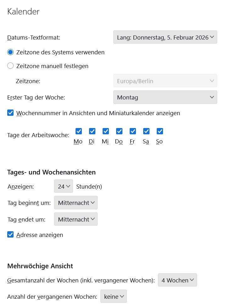 ich möchte gerne das im Thunderbird Kalender die Tage Montag bis Sonntag angezeigt werden.