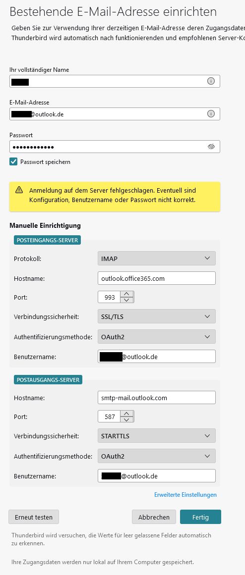 Prüfe ich manuell die Einstellungen der automatischen Server-Erkennung, so finde ich keinen Fehler, siehe 2. Screenshot sowie wie hier: https://support.microsoft.com/de-de/office/pop-imap-und-smtp-einstellungen-für-outlook-com-d088b986-291d-42b8-9564-9c414e2aa040