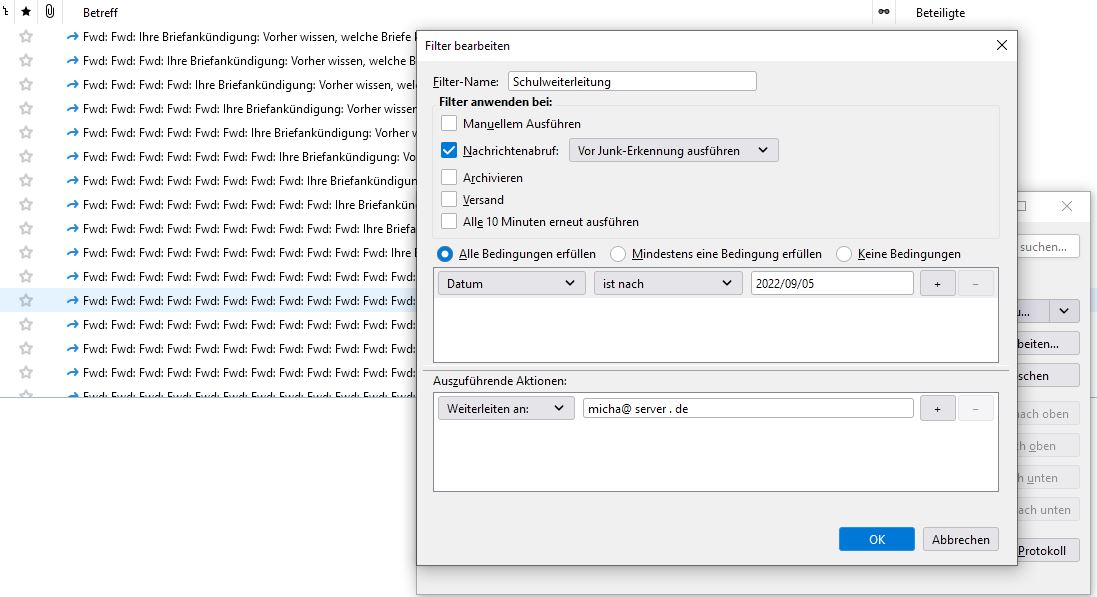ich habe hier folgendes Problem: Unser Junior hat auf seiner Schule automatisch auch eine Email-Adresse bekommen, zu der es auch eine für Eltern für den Austausch mit den Lehrern gibt. Ich würde jetzt gerne diese Emails automatisch an eine andere Adresse weiterleiten - sie müssten aber weiter bei mir angezeigt werden. Das müsste zudem direkt über Thunderbird laufen, da ich keinen Zugriff auf den Server habe.