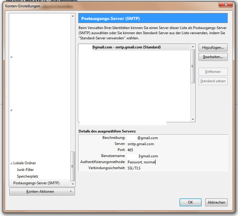 Seit ein paar Tagen kann ich keine Mails mehr in Thunderbird versenden. Ich nutze ein Gmail.com Konto, Windows 8.1 und Mozilla Thunderbird Version 45.7.1. Mit der Handy-App (Gmail auf Android) kann ich die Mails problemlos verschicken, aber am PC tut er immer lange herum und es erscheint dann die Fehlermeldung "Senden der Nachricht fehlgeschlagen. Die Nachricht konnte nicht gesendet werden, weil die Verbindung mit dem SMTP-Server smtp.gmail.com ihre Ablaufzeit (Timeout) überschritten hat. Versuchen Sie es nochmals."