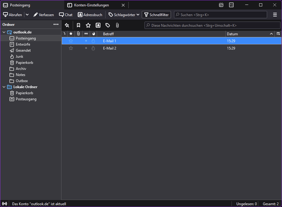 - Im Posteingang des Kontos "Outlook" und damit auf dem Server befindet sich nur noch die E-Mail "E-Mail 2".