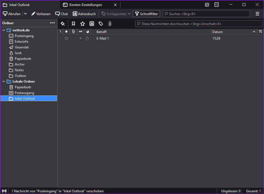 - Aus dem Posteingang des Kontos "Outlook" die E-Mail "E-Mail 1"