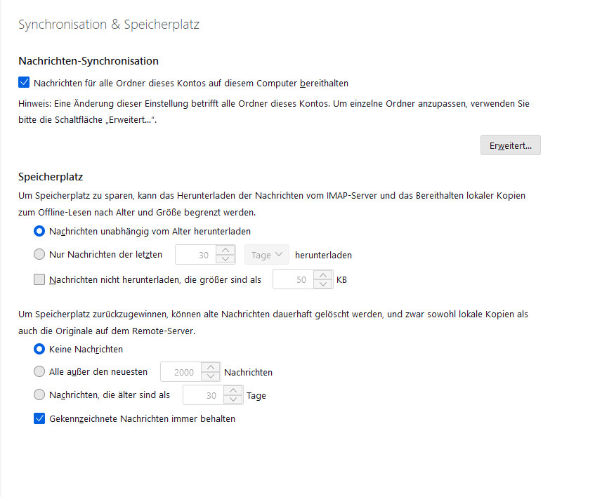 ich hoffe ihr könnt mir helfen. Bei einem meiner Mailaccounts, für den ich über Thunderbird die Mails abrufe, verschwinden die Mails taggenau nach 30 Tagen - sind einfach nicht mehr da. Angefangen hat es vor einigen Wochen, ich glaube ich hatte da irgendwo in den Einstellungen herumgeklickt (weiß nur nicht mehr genau, wo...). Aber wenn ich mir den Screenshot anschaue, sieht es für mich nicht so aus, als würde nach 30 Tagen automatisch gelöscht werden - zumal die fehlenden Mails ja auch nicht im Papierkorb sind. Die lösen sich förmlich in Luft auf. Hat jemand eine Idee?
