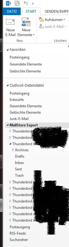 MailStore hat mir nun in OL einen Reiter Namens "MailStore" erstellt, in dem dann die einzelnen Postfächer der 10Accounts liegen. Klappe ich eine von diesen auf, bekomme ich weitere Order: Drafts, Inbox. Sent, Trash