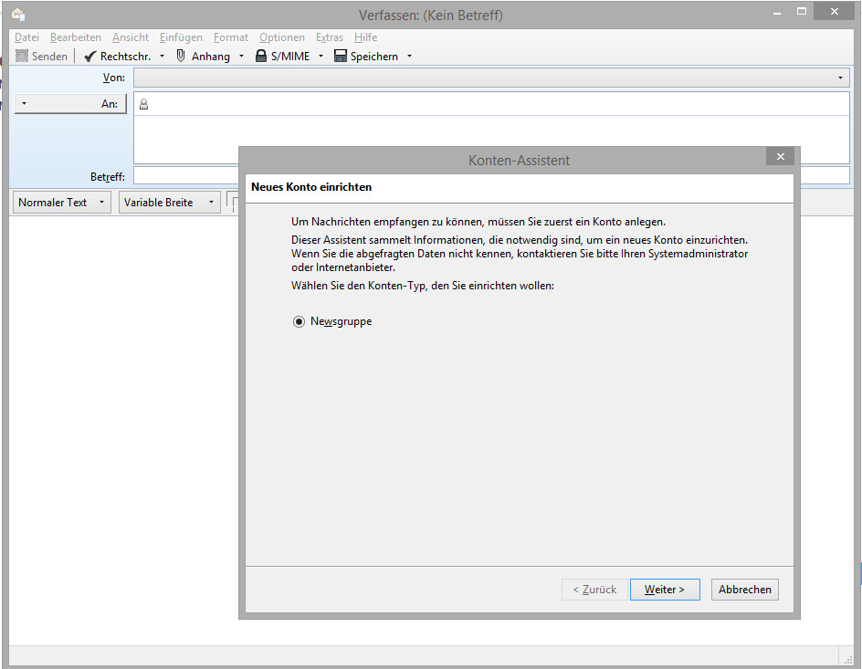 Wenn ich auf einer Webseite einen Link sehe wie "E-Mail schreiben" wohinter zb ein mailto:test@domain.com Befehl versteckt ist klicke, gehe ich davon aus, dass mein Thunderbird (bereits registriert als Standardanwendung) anspringt und ich von einem meiner konfigurierten Konten eine Mail schreiben kann. Stattdessen kommt oben besagte Meldung. Es wird nicht erkannt, dass ich bereits Konten habe, stattdessen will er mir irgend ein Newsgroup Konto anlegen.