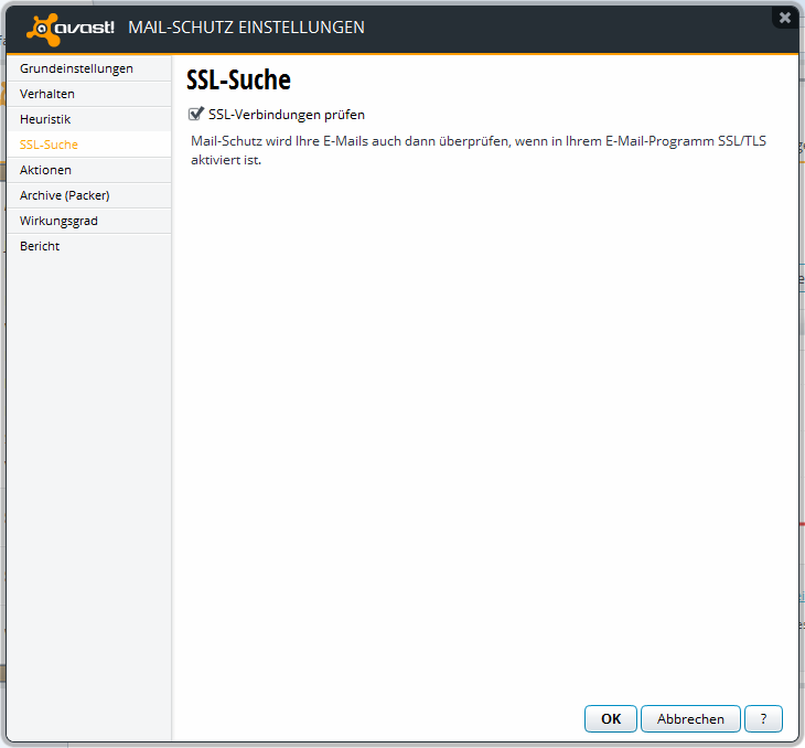 Edit: Das Zertifikat muss nicht bestätigt werden, wenn die obige Option "SSL-Verbindungen prüfen" einmal deaktiviert und wieder aktiviert wird. Dann installiert sich Avast als CA in Thunderbird und authentifiziert sich damit selbst.