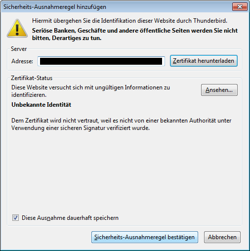 Vorsicht: Wenn diese Zertifikatswarnung danach noch einmal auftreten sollte, könnte es sein, dass jemand eure Verbindung abhört!