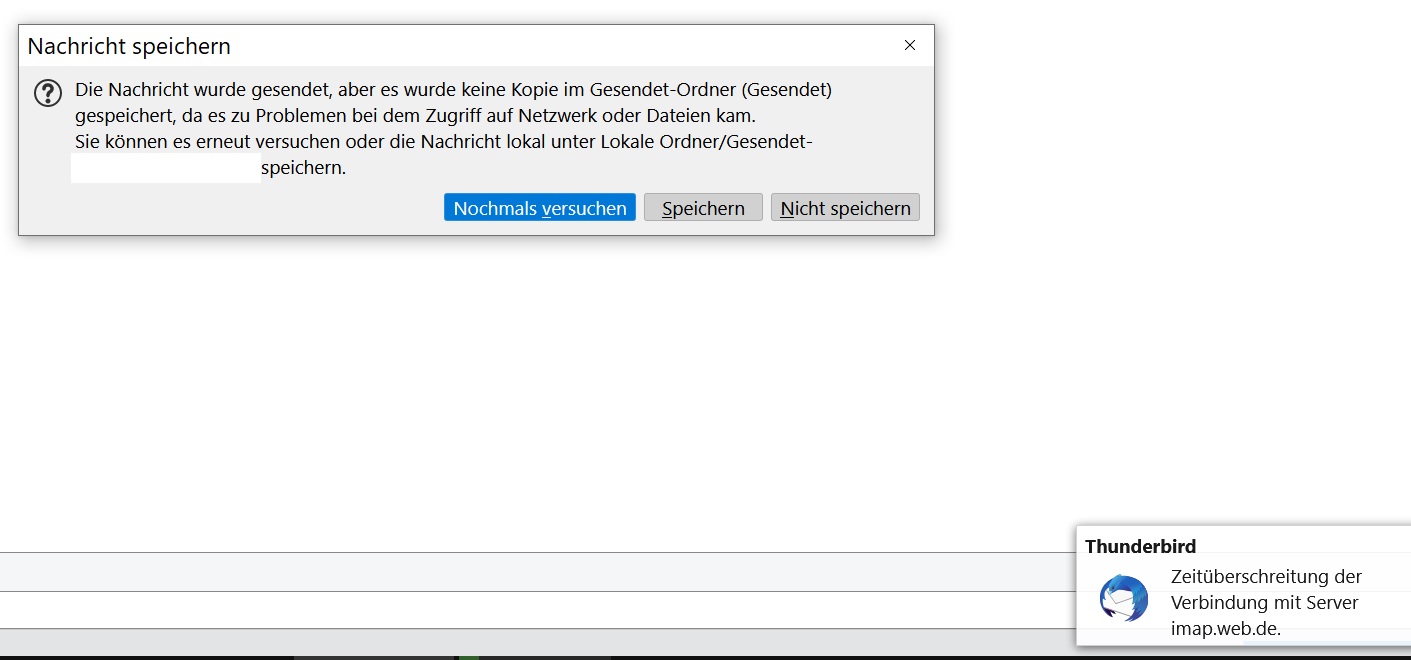 wie bereits im anderen Thema von mir bezüglich Thunderbird angesprochen, habe ich seit einger Zeit das Problem, dass beim Senden von Emails mit Anhang >1MB eine Fehlermeldung kommt (s.screen) wonach die Email zwar versendet wurde, aber nicht im Gesendet-Ordner gespeichert wurde. 1min später ist die Email samt Anhang sehr wohl im Gesendet-Ordner -und dann sogar 2x, also doppelt. Emails mit nur 1MB Anhang werden ohne Probleme versendet.