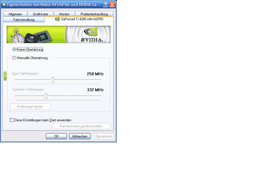 Also ich wollte meine Albatron ti 4200 übertackten und nun habe ich im Forceware nach den Tackfrequenzen geschaut. Sind diese Zahlen normal für ne Ti4200(siehe Anhang)? Weil andere schreiben sie haben 250 / 500.