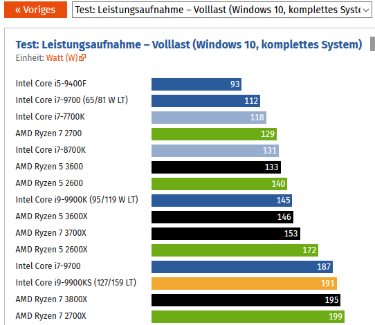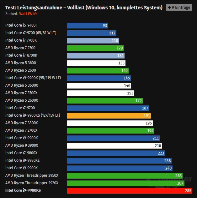 Wie wendet sich denn das Blatt zwischen einem 3800x Volllast 195W vs 9900ks 191W zu 285W in Bezug auf die Leistung?