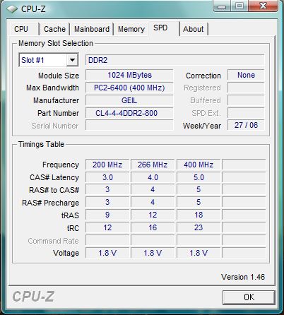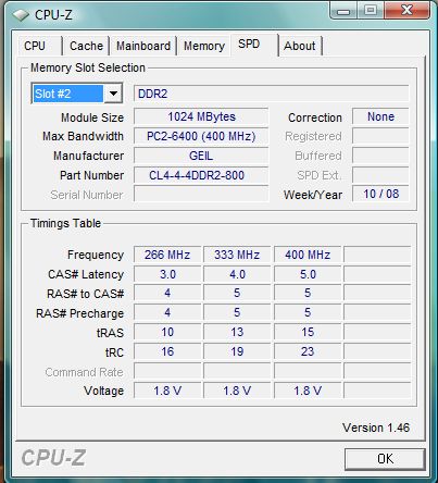 Seit dem Umstieg auf Vista vergangene Woche rüstete ich auf 4GB auf und holte mir nocheinmal 2x1 GB des gleichen Speichers (GX22GB6400UDC). Diese steckte ich in die beiden schwarzen Slots.