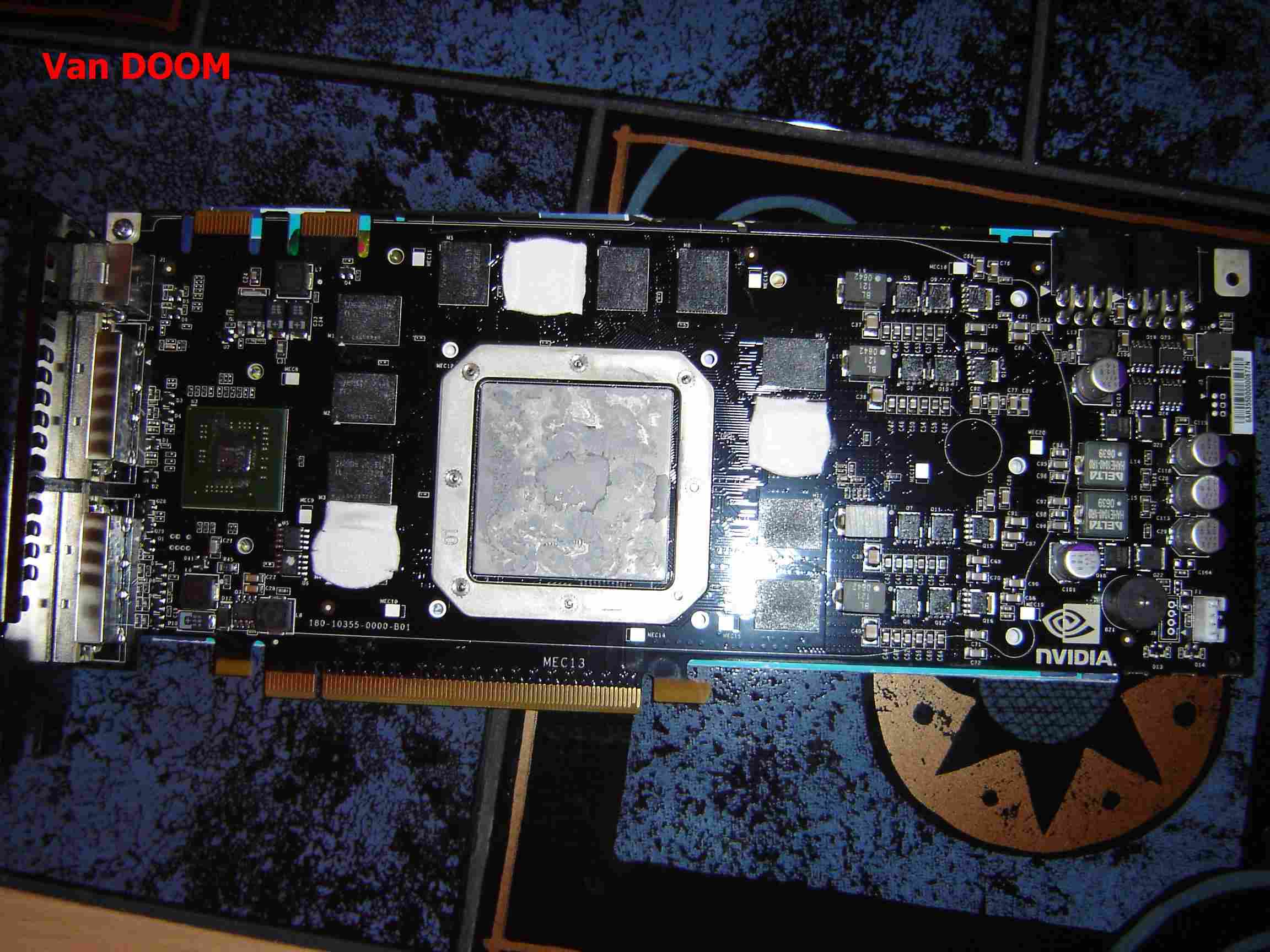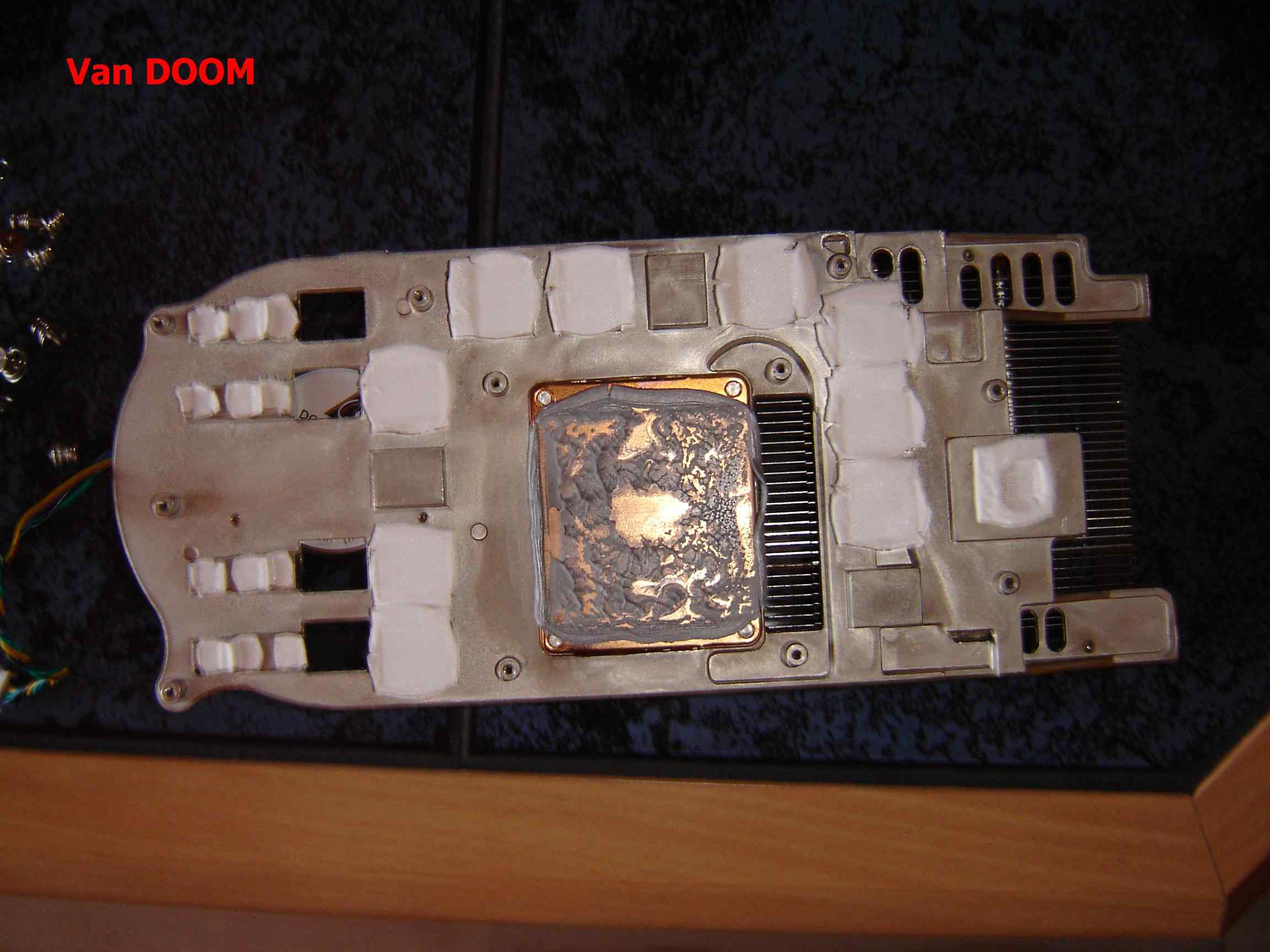 Vom Luftkühler/den Cips habe ich nach der Demontage Wärmeleitpaste abgewischt, die zum Füllen von 3 handelsüblichen Spritzen Arctic Silver 5 (von der GPU) und 2-3 großen Spritzen Siliconpaste (RAM's, Spannungsregler, Videochip) gereicht hätte. Die Schichten waren jeweils etwa 1,5 - 2mm dick.