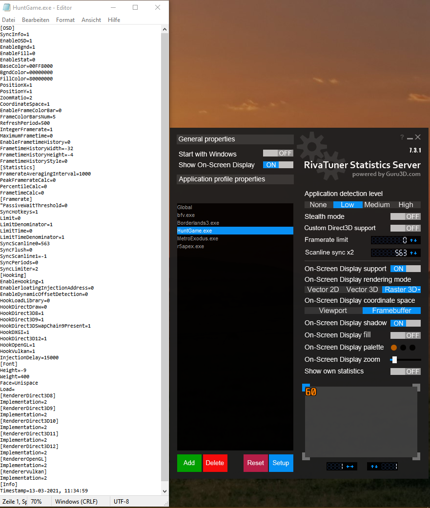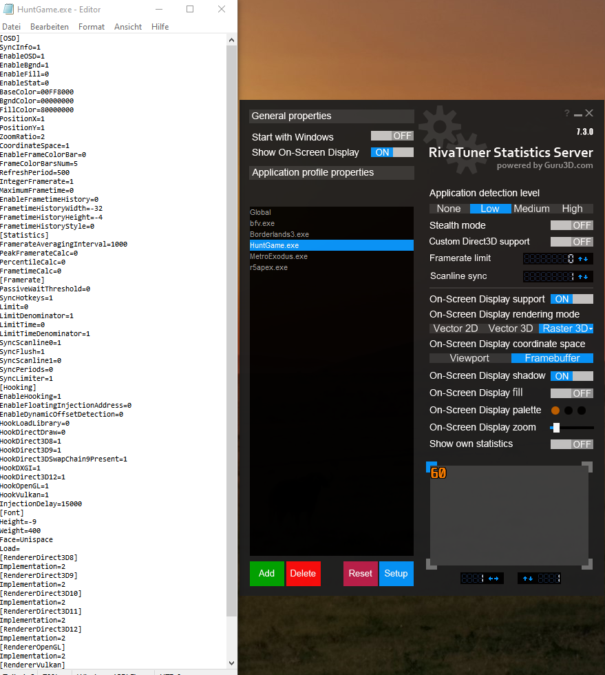 @Creekground jein, ich habe die Anleitungen noch nicht gelesen, habe mir aber für Hunt.exe ein Profil im RTSS angelegt, sowie s-sync auf 1 gestellt. Ich kann noch nicht einschätzen, ob sich etwas verändert hat, oder ob das jetzt auch wirkt. Ich weiß z.B. noch nicht, wie ich diese von dir gezeigte Textdatei anlege