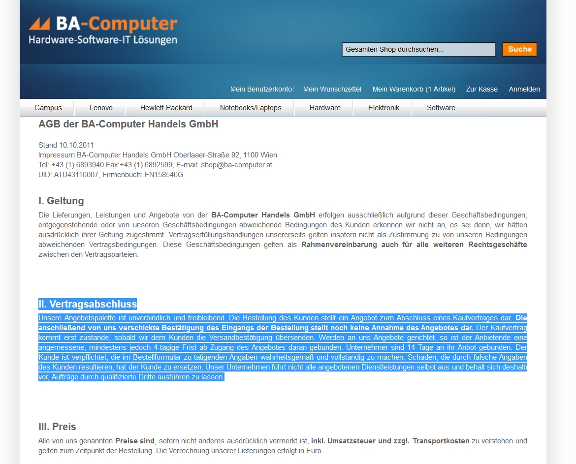 Wenn du auf der Bestellung beharrst, werden sie liefern. In der Theorie "Irrtumsanfechtung" ist das ja alles super lustig. Aber keiner will einen Prozess führen, den man auch verlieren könnte. Denn eindeutig ist das garantiert nicht. Vorallem BA-Computer die seit Jahren in Wien tätig sind. Ich bin auf BA-Computer gekommen, weil sie (neben Conrad) als einziges Unternehmen Feinelektronikteile angeboten haben.