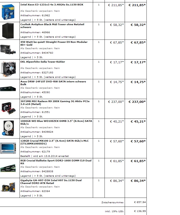 nochmal danke, ihr habt mir sehr geholfen. Hab jetzt soweit alles zusammengestellt und würde es so nächste Woche bestellen. Könnt ihr trotzdem nochmal ein Blick darauf werfen. Nicht das doch noch was falsch ist.